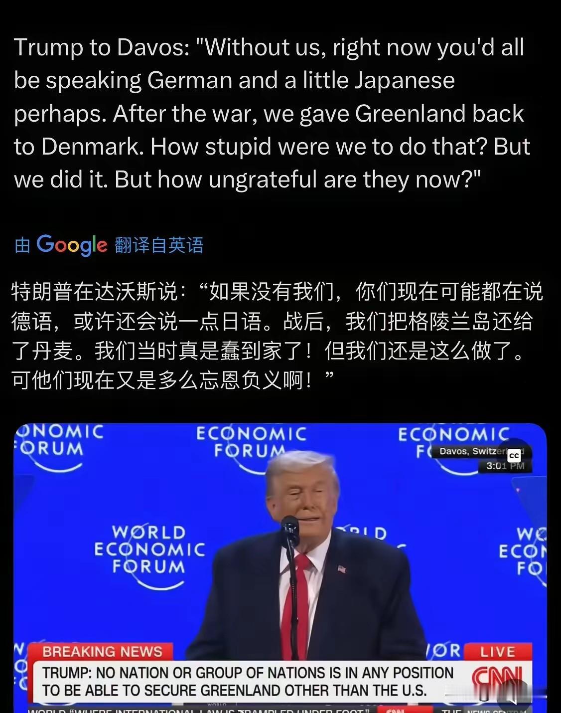 特朗普嘲笑欧洲“如果没有美国,在座的可能都会说德语和一点点日语” 不得不说特朗普确实会往欧洲各国心上戳刀子,特朗普在达沃斯论坛上称“如果没有我们(美国)你们现在可能都在说德语,或许还会说一点日语”,这确实让欧盟的核心成员国法国、德国、意大利三国难受。说白了特朗普就是想用二战来刺激欧洲。 特朗普更加深层次的心思就是想要欧盟分裂,现在的欧盟可谓是美国的心腹大患。