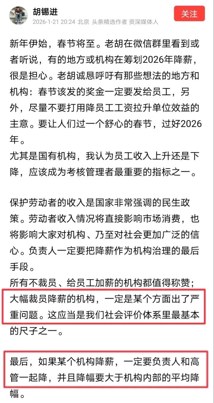 胡锡进竟然要求降低机构负责人和高管的薪水,却不要求降低像老胡这种退休干部的薪水,这是怎么回事呢? 原来胡锡进看到或者听说“有的地方或机构在筹划2026年降薪”,他认为“大幅裁员降薪的机构一定是某个地方出现了严重问题”,为此老胡呼吁“如果某个机构降薪,一定要负责人和高管一起降”。 可是胡锡进说来说去,唯独不说要同步降低退休干部的高额养老金。要知道胡锡进曾担任多年的环球时报总编,属于厅局级干部,可见作为退休干部的老胡每年都能领取不菲的退休金。 那么胡锡进一边要求降低现任负责人和高管的薪水,一边绝口不提降低自己这种退休干部的高额养老金,老胡这是在慷他人之慨吗?
