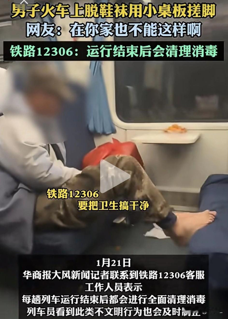 火车上惊现“搓脚大师”!男子用桌板搓完脚又蹭座套,网友:隔着屏幕都闻到味了! 见过在火车上脱鞋的,没见过这么会“玩”的! 1月20日,一段视频直接把网友看吐了——某趟列车上一大哥,竟然把小桌板当成了“搓脚石”,搓完脚还不过瘾,又把脚丫子踩在座椅上,用座套来了个深度“足部按摩”! 视频里,这位老哥淡定自若,先脱鞋袜,然后抬起一只脚,用列车小桌板的边沿开始上下搓动,动作娴熟得像在磨菜刀。 搓完一只换另一只,完事儿还把脚直接踩在座椅上,用座套来回摩擦,一套流程行云流水,完全把车厢当成了自家洗脚房。 网友评论区直接炸锅: “我的天!我正在吃饭!!!” “这是练的什么功?铁脚磨桌板?” “隔着屏幕都感觉味道冲出来了……” “建议铁路部门给他单开一个‘足疗专座’!” 还有福尔摩斯网友分析:“这搓法,八成是脚气发作痒得不行,但这也太不顾别人感受了吧!” 大风新闻的记者赶紧联系了铁路12306,客服回应说:“每趟列车跑完一趟都会全面清理消毒,乘务员看到这种不文明行为也会及时制止。” 言下之意:咱铁路卫生有保障,但架不住个别乘客“才艺展示”啊! 说真的,车厢是公共空间,不是谁的私人足疗店。 这波操作,恶心了全车人,还可能被列入铁路黑名单。下次出门前记得:带走的不仅是行李,还有基本素质! 素材来源:大风新闻,侵联删!