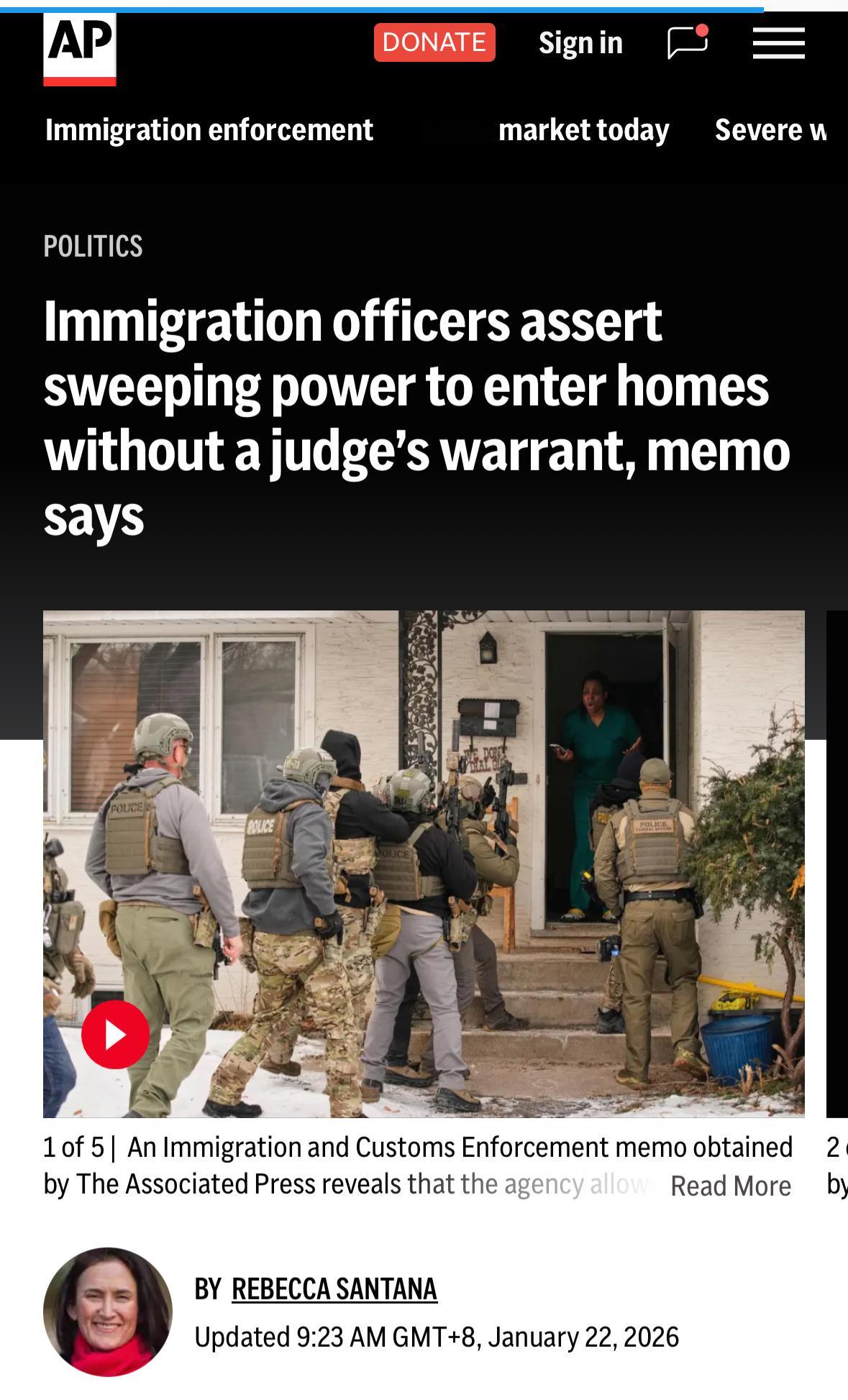 据美联社获得的一份美国移民和海关执法局内部备忘录显示,联邦移民官员正在行使广泛的权力,可以在没有法官搜查令的情况下强行闯入民宅。这种行为恐怕是G20国家中唯一一个。