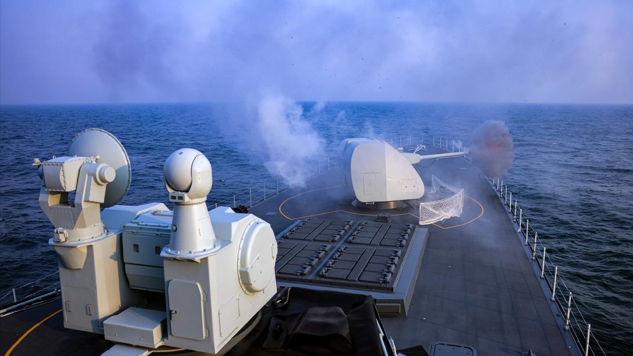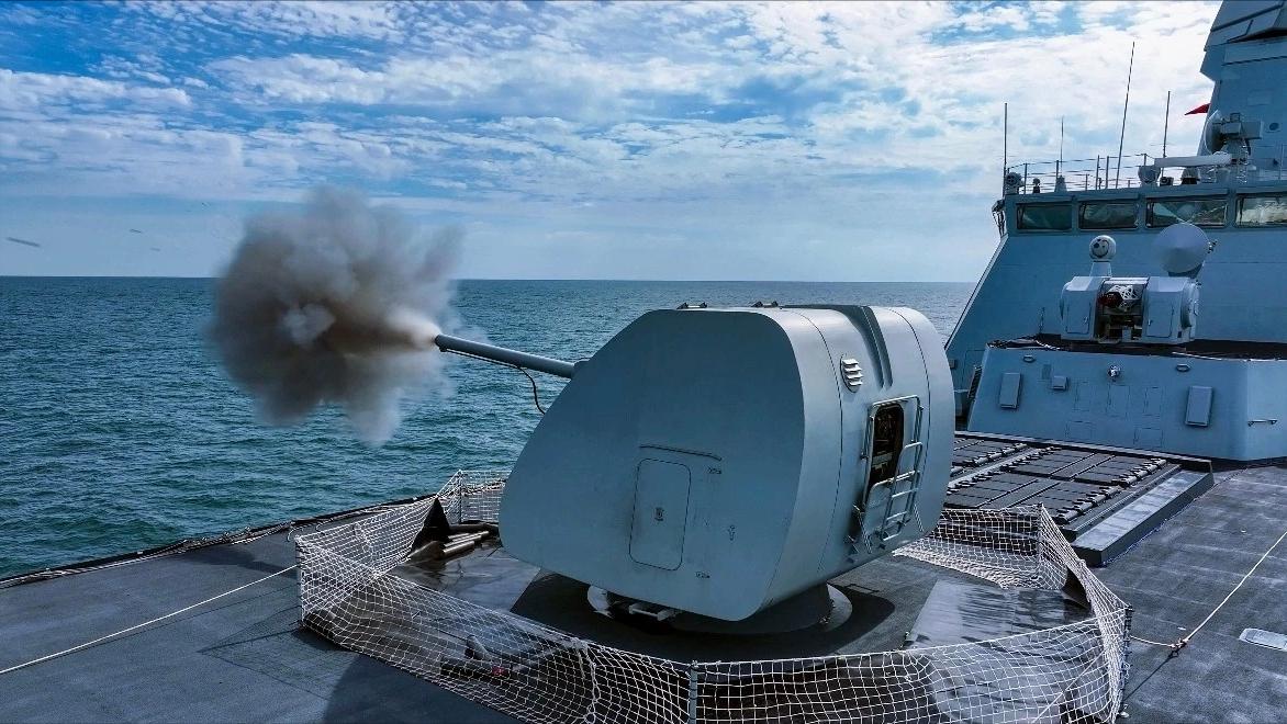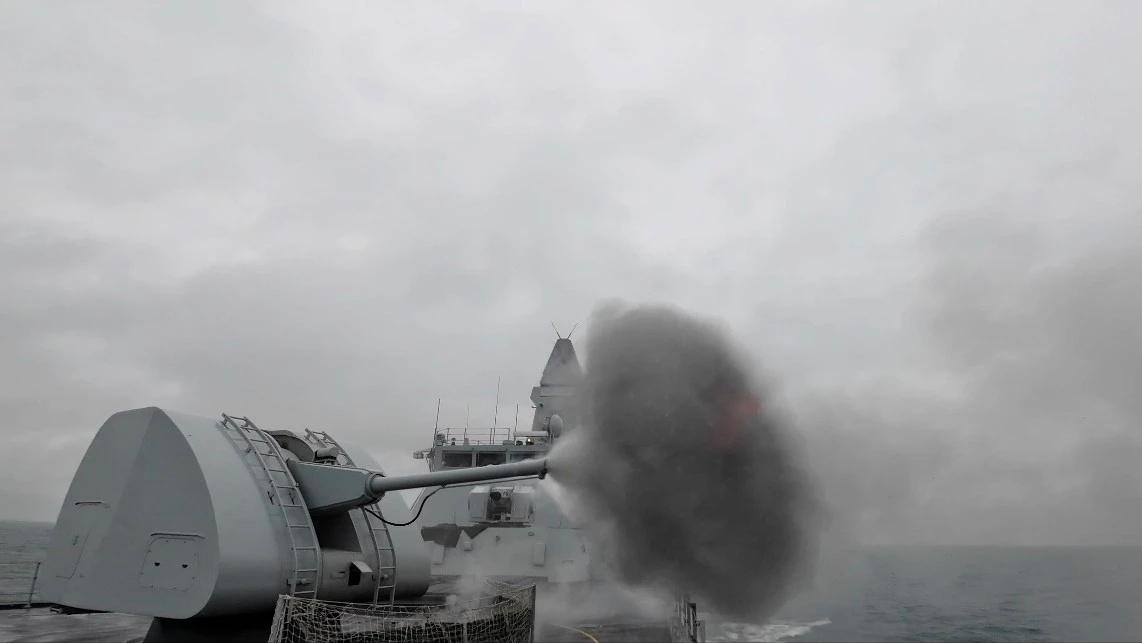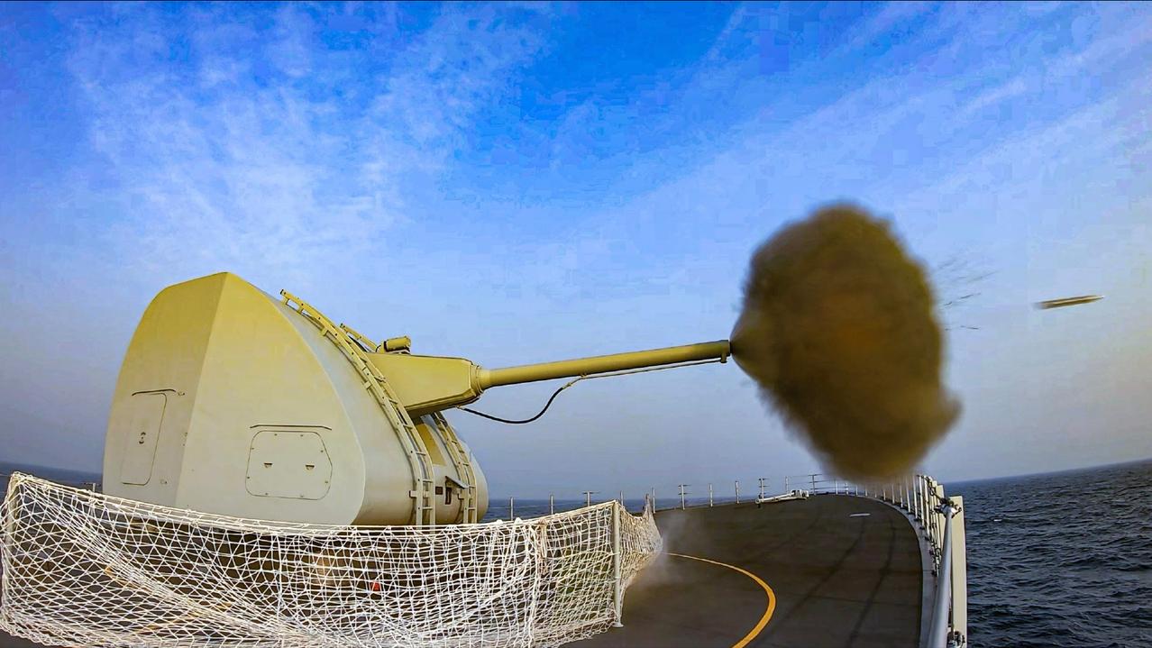 首见“广西”舰55毫米反蛙人火箭炮实弹发射画面。 该系统采用水声探测与自动瞄准技