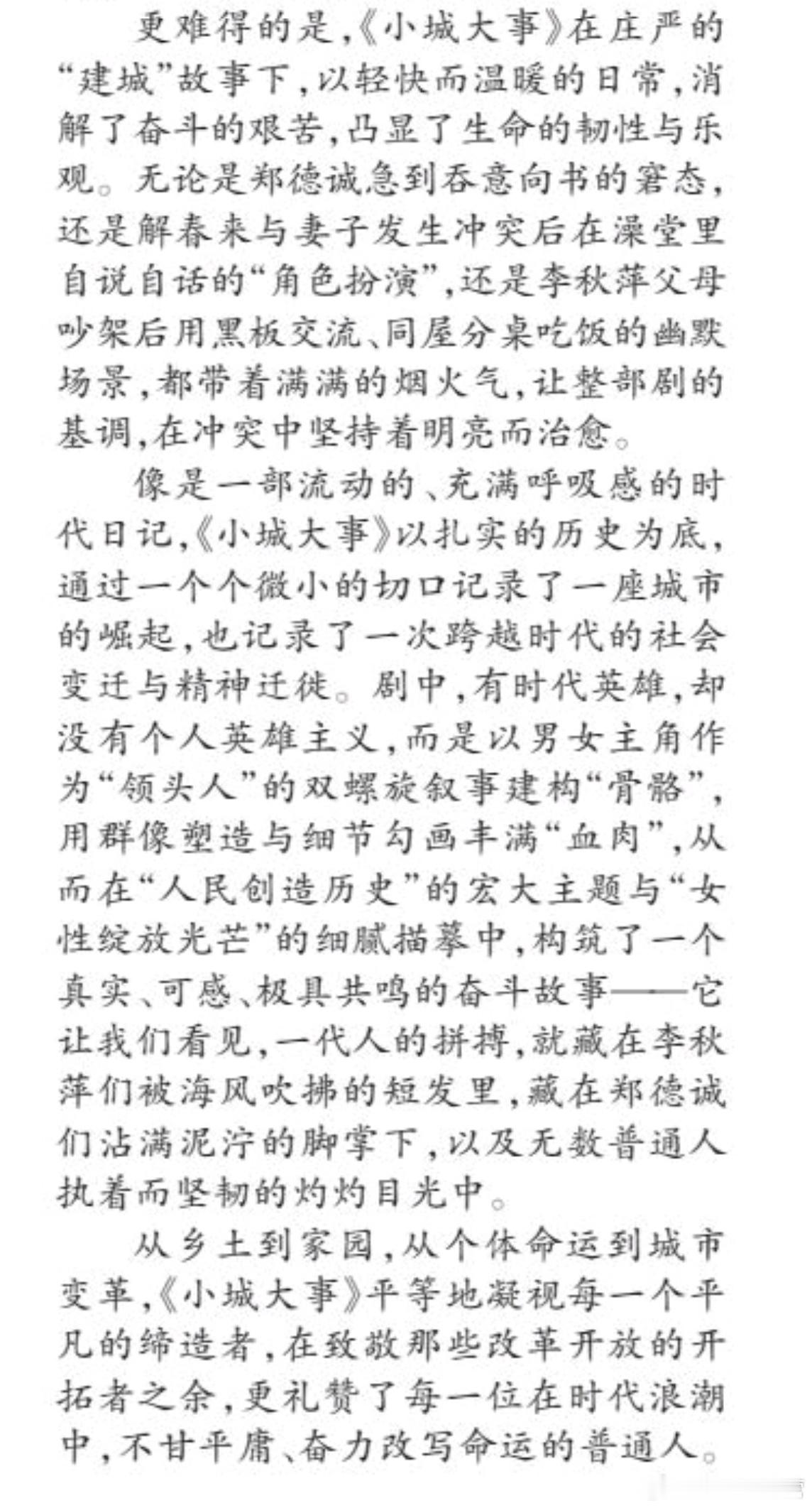 中国妇女报——《小城大事》热血澎湃的时代日记!从乡土到家园,从个体命运到城市变革,《小城大事》平等地凝视每一个平凡的缔造者,在致敬那些改革开放的开拓者之余,更礼赞了每一位在时代浪潮中,不甘平庸,奋力改写命运的普通人。小城大事