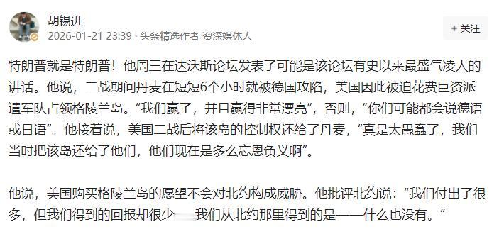 胡锡进:特朗普就是特朗普!他周三在达沃斯论坛发表了可能是该论坛有史以来最盛气凌人的讲话。他说,二战期间丹麦在短短6个小时就被德国攻陷,美国因此被迫花费巨资派遣军队占领格陵兰岛。“我们赢了,并且赢得非常漂亮”,否则,“你们可能都会说德语或日语”。他接着说,美国二战后将该岛的控制权还给了丹麦,“真是太愚蠢了,我们当时把该岛还给了他们,他们现在是多么忘恩负义啊”。 特朗普这话一出口,达沃斯论坛的场子瞬间就炸了。他口中的“忘恩负义”,压根站不住脚。 先掰扯清楚二战那点事,1940年4月9日,德国发动闪电战进攻丹麦。丹麦军队抵抗力度有限,确实在短短6小时内就宣告投降。这个时间点有明确史料记载,特朗普没瞎编,但他刻意偷换了概念。 美国当年出兵占领格陵兰岛,真不是“被迫”的。格陵兰岛是丹麦的自治领地,地理位置极特殊,卡在北美、欧洲和北极的十字路口。德国占领丹麦后,美国担心德国会利用格陵兰岛建立军事基地,威胁北大西洋航线安全。 美国是主动出手掌控格陵兰岛防务的,1941年还和丹麦流亡政府签了专门的防务协定。美军在岛上建了多个军事基地,核心目的是守住北大西洋的生命线,同时监控德军动向。所谓“花费巨资”,本质是为了美国自身的战略安全,而非单纯“拯救”丹麦或欧洲。 特朗普说“我们赢了,并且赢得非常漂亮,否则你们可能都会说德语或日语”,这话纯属往自己脸上贴金。二战的胜利是反法西斯同盟共同努力的结果,苏联、中国、英国等多个国家都付出了巨大牺牲。 美国在二战中的贡献值得认可,但把胜利全揽在自己身上,还暗示欧洲全靠美国拯救,完全无视其他国家的付出。这种表述既不符合历史事实,也暴露了他一贯的霸权思维。 再看他吐槽“把格陵兰岛还给丹麦太愚蠢”。二战结束后,美国确实把格陵兰岛的控制权交还给了丹麦。这不是“愚蠢”,而是基于国际法和同盟关系的正常操作。 美国对格陵兰岛的觊觎,从来就没断过。早在上世纪60年代,美国就曾出价想买下格陵兰岛,被丹麦直接拒绝。后来冷战期间,美国通过防务协定,继续在岛上保留军事存在,图勒空军基地至今仍是美国在北极的重要战略前哨。 特朗普现在翻旧账,根本不是真的后悔当年还岛。他是想借这个由头,为现在谋求控制格陵兰岛找借口。格陵兰岛拥有丰富的稀土、石油等资源,气候变暖后,北极航道的商业和军事价值更是暴增。 美国把格陵兰岛视为“核心国家安全利益”,说白了就是想掌控北极的战略主动权,同时抢占资源先机。特朗普口中的“忘恩负义”,其实是不满丹麦和欧洲不配合他的“购岛”计划。 丹麦方面早就明确表态,不会就格陵兰岛的主权问题进行任何谈判。欧盟也站出来发声,强调丹麦和格陵兰岛的领土主权完整不容谈判,关税威胁和武力恐吓都改变不了事实。 特朗普这次在达沃斯的讲话,把他的行事风格展现得淋漓尽致。他习惯用夸张的表述煽动情绪,用历史虚无主义歪曲事实,用霸权手段施压盟友。 他批评欧洲能源政策、吐槽北约不公平对待美国,再到拿格陵兰岛说事,核心逻辑都是“美国优先”。凡是符合美国利益的,他就支持;凡是阻碍美国利益的,他就指责、威胁。 胡锡进说“特朗普就是特朗普”,这句话精准点透了本质。不管是过去还是现在,特朗普的所有言论和行动,都围绕着个人政治诉求和美国霸权利益。 他不在乎历史真相,不在乎盟友情谊,更不在乎国际法规则。只要能达到目的,他可以随意歪曲历史,可以公开威胁盟友,可以说出最盛气凌人的话。 这次达沃斯讲话,与其说是演讲,不如说是特朗普的一次政治宣示。他在向欧洲、向世界表明,只要他上台,美国的霸权行径只会变本加厉。 欧洲国家也不是傻子。法国总统马克龙直言,帝国主义的野心正在重新浮出水面。比利时首相也表态,欧洲不能再一味妥协,要做出选择。 特朗普的狂言,看似强硬,实则暴露了美国的焦虑。随着多极化趋势加剧,美国想继续独霸世界的难度越来越大。他只能靠这种盛气凌人的姿态,掩盖内心的不安。 总而言之,特朗普的话听听就行,别当真。但他背后代表的美国霸权思维,值得全世界警惕。