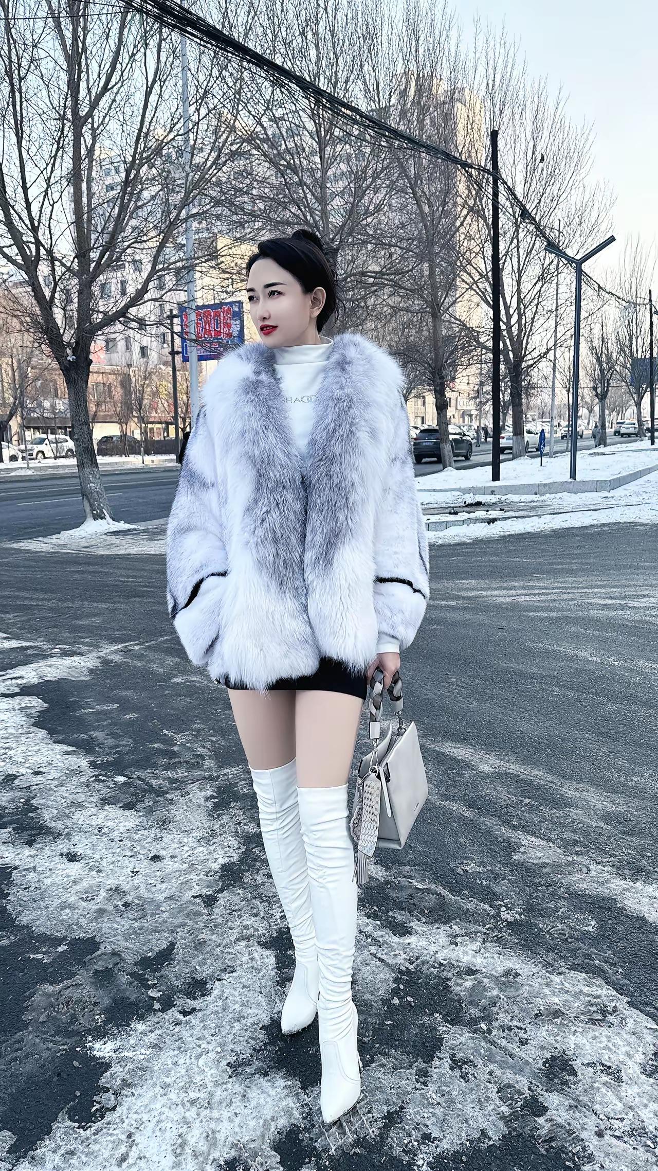 白色短款毛衣搭配毛绒短裙,优雅又俏皮,完美展现时尚感!