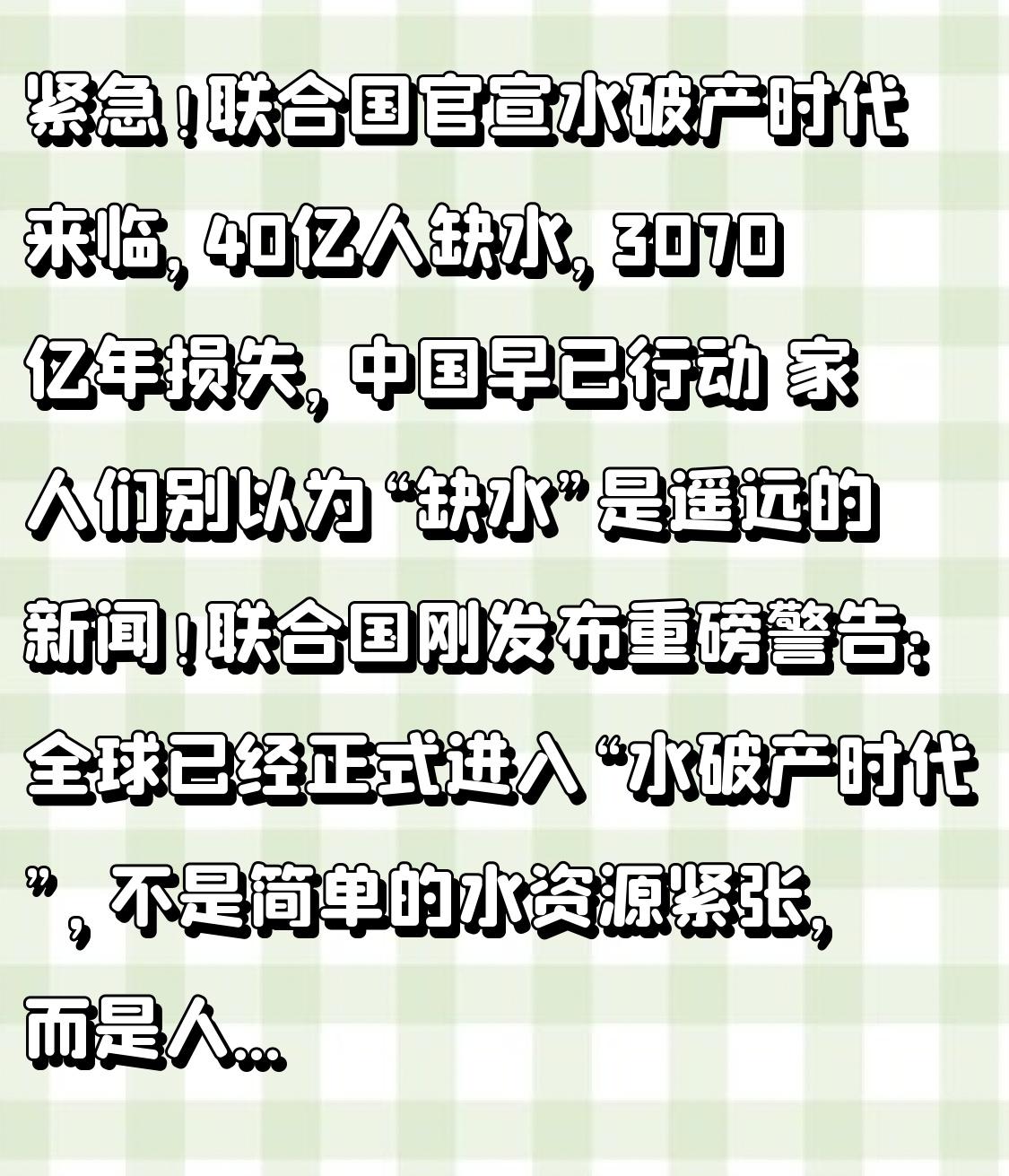 紧急!联合国官宣水破产时代来临,40亿人缺水,3070亿年损失,中国早已行动 家人们别以为“缺水”是遥远的新闻!联合国刚发布重磅警告:全球已经正式进入“水破产时代”,不是简单的水资源紧张,而是人类取水、污染的速度,已经超过了地球水资源的自然补给极限,而且湿地、冰川这些关键水系统的破坏,再也回不去了! 这可不是危言耸听!报告里的数据触目惊心:全球75%的人生活在“水资源不安全”的国家,每年至少有一个月,40亿人要面临严重缺水;自90年代以来,全球一半以上的大型湖泊都在缩水,35%的天然湿地永久消失,70%的地下含水层一直在透支,相当于地球的“水银行”已经空了!更可怕的是,干旱每年造成的经济损失高达3070亿美元,比很多国家的GDP还高,而阿富汗喀布尔可能成为第一个彻底断水的大城市,墨西哥城因为超采地下水,每年要下沉50厘米,地面全是裂缝! 本以为这是全球通病,没想到深挖下去有个关键反转:水破产不是“绝症”,而且中国早就提前布局应对了!咱们国家人多水少,早就意识到水资源的重要性,早在2019年就出台了《国家节水行动方案》,从农业、工业到生活全方位节水,目标到2035年让水资源利用达到世界先进水平 。现在农村推广滴灌、喷灌技术,农田灌溉水利用率越来越高;工业企业搞循环用水,废水处理后再利用,连城市里的供水管网漏损率都控制在10%以内,这些看不见的努力,正在为我们筑牢“水安全屏障”。 但更让人揪心的是,水危机带来的不公:小农生产者、低收入群体、妇女和青年,往往是最受影响的人,而大资本过度开发水资源赚得盆满钵满。对咱们普通人来说,水破产也不是没感觉:北方部分城市限制洗车、浇花,南方一些地区遭遇伏旱时,自来水水压变小,甚至连农作物都因为缺水减产,水价也在悄悄上涨。 不过大家也别慌,联合国专家明确说,“水破产”是治理模式转型的起点,不是终点。对国家来说,要继续推进节水工程、打击非法取水和污染;对我们每个人来说,节水不是口号,而是日常小事:随手关紧水龙头,洗菜水冲厕所,用节水器具,夏天少用高压水枪洗车。这些看似微不足道的动作,累积起来就能缓解巨大的用水压力。 要知道,地球的水资源是有限的,我们现在浪费的每一滴水,都是在透支子孙后代的生存权。联合国已经敲响了警钟,2026年、2028年的联合国水资源会议,就是全球行动的关键节点。咱们不用等着别人行动,从今天起,把节水变成习惯,就是对水危机最有力的回应。 你平时有哪些节水小技巧?你觉得还有哪些措施能缓解水危机?评论区聊聊你的看法,别忘了点赞转发,让更多人知道:节约用水,不是选择,而是必须!