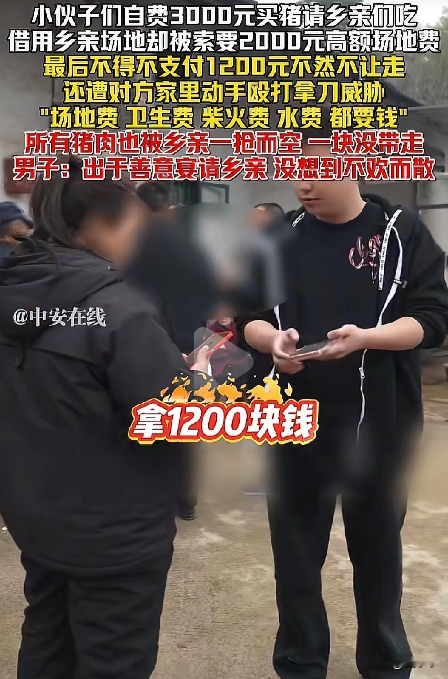 “后悔了吗?”湖南株洲,小伙子自费3000元买一头猪请乡亲们免费吃,借用场地却被索要2000元场地费,最后不得不支付1200元才让走,小伙子:出于善意请乡亲们吃肉,没想到却不欢而散。网友:不要试探人性,你永远不知道人性的底线。 (信息来源:中安在线) 从视频中来看,几位小伙子事先是和主家说好的,因为是借用主家的场地,小伙子为了表示感谢,直接拿了一大块的猪肉给他们。 但,不知道怎么了,另一位老太太出来不乐意了,直接让他们给2000元的场地费,还包括,水费,卫生费,柴火费,如果不给那就不能走。 小伙子刚开始不理解,还一直说着,我们是好心请你们吃饭,你们怎么还这样。 其中一位主家放狠话,你们搞不起就不要搞,我吃个p,说完直接就过来想要动手,不过好在有人拦住了他。 最后,在双方的协调下,小伙子还是支付了1200元才能离开。 此事引发热议! 有网友表示,车过湖南高速都得脱层皮,你居然敢进村杀猪、你们这是家里有矿么。 还有网友表示,你要做服务于村民,这些事就得找村委会商量,村委会会协助于你,找村民肯定有人有私心俗话说得好,人心不足蛇吞象,世事到头螳捕蝉… 更有网友表示,怪不得这些货车司机说:“吃饱饭,加满油,到了湖南别停留;宁走云贵川,不走湖南鬼门关;宁绕湖北三百里,不走湖南一公里。” 原来乡下也这么可怕吗? 看着小伙子年纪也不大,一看就没经验,你不管搞什么活动,必须先去和当地村委沟通,杀猪也只能再大队杀,通知也得让大队喇叭通知,不要自己去。 人心险恶,这也是花钱上了一课,对以后也有帮助的。 对此,大家怎么看?