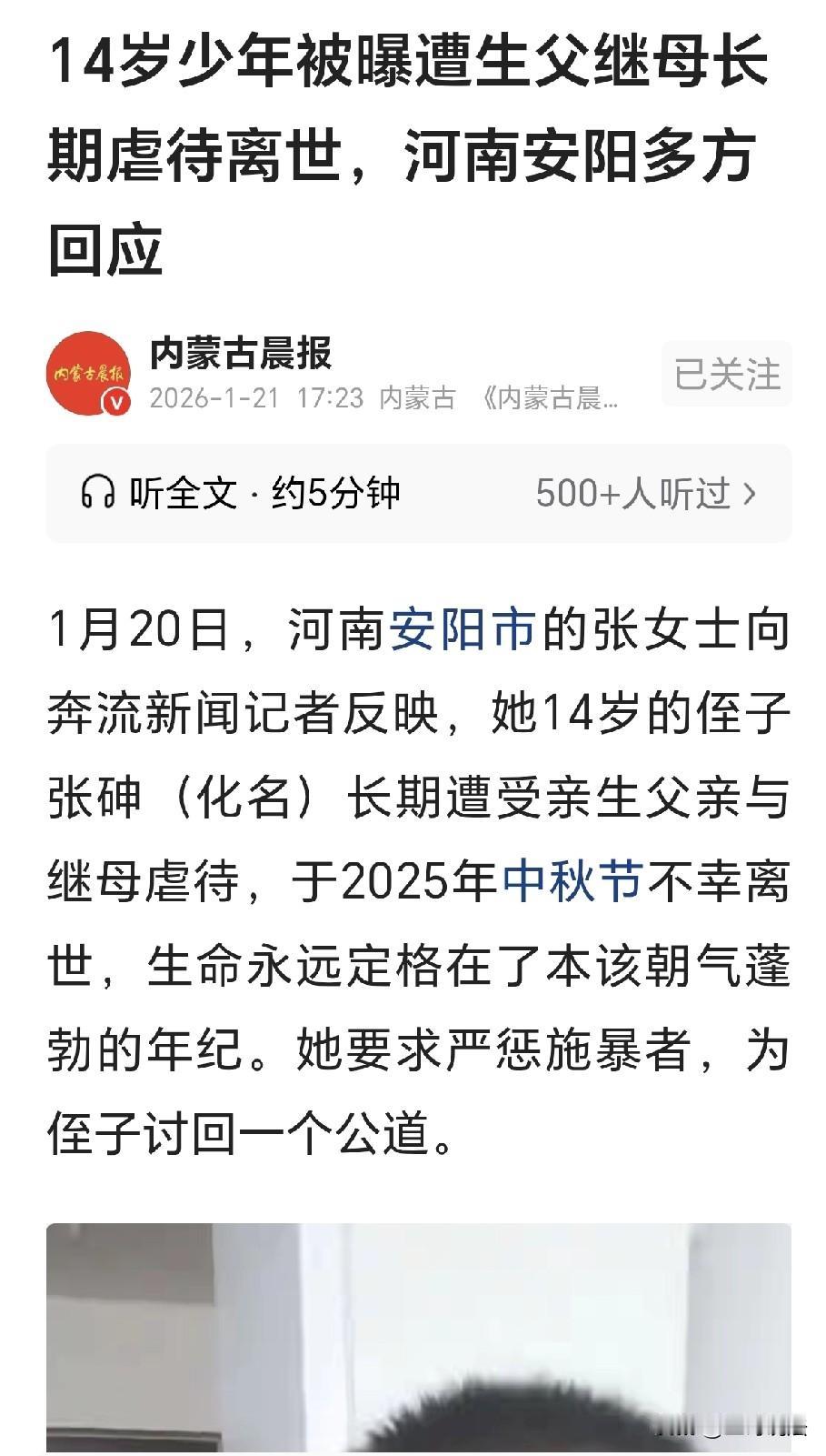 有了后妈,爹都不亲了!河南安阳,一14岁男孩长期被亲生父亲和继母虐待,姑姑看到他浑身是伤,想收养他,父亲拒绝,不久,姑姑听到男孩死讯,她这才知道,侄子肝坏死,肺出血,脑出血,身体机能是败血症状态,孩子死亡时穿着尿不湿,胃里是空的,肚子是扁的,肋骨凸起,活脱脱一副骷髅人的样子,男孩临死前向继母哀求: 给我倒杯水喝…… 据悉,1月20日,张女士向记者说道,她的侄子张砷只有14周岁,跟着亲生父亲和继母生活。 可是父亲和继母对他长期虐待,还不让侄子吃饭,导致张砷在2025年的中秋节时,离开了人世。 张女士心疼的大哭,侄子张砷非常的可怜,他出生才有半岁时,他的母亲就离家出走,从此后再也没有和他联系。 张砷的父亲在外面开车,他靠运输货物维持着生计。 因为他长期在外,根本就无法照顾张砷,因此张砷从小的时候,都是在奶奶和姑姑身边成长。 奶奶的年纪慢慢的大了,姑姑张女士带他到家里生活,张砷在姑姑身边,感受到姑姑母亲般的爱护。 他从此以后,生活快乐,活泼开朗,和张女士的孩子在一起学习生活。 他从小就懂事,知道姑姑对自己的恩重如山,他小小的年纪,就会帮助姑姑做一些家务。 张砷在姑姑的呵护下快乐成长,他虽然没了母亲,可是他还有姑姑这样最亲的人。 事情的转变,是从父亲结婚开始,2020年的时候,张砷父亲和继母相识。 不久后父亲结婚,到了2021年的下半年时,张砷父亲找到姑姑,非说他要自己亲自抚养孩子。 那时张砷刚满9岁,他懵懵懂懂,以为从此就能和父亲幸福的生活。 谁知,这才是一场厄运的开始,张砷满怀希望,回到了父亲身边,姑姑深深的祝福,希望孩子能有更好的生活。 谁知几个月后,张女士偶然路过张砷的学校,张砷放学,离老远就看到了姑姑。 张砷的眼泪扑簌簌的掉落,他脸上有一大块淤青,可是他怕姑姑担心,默不作声,啥也不敢对姑姑说。 没过几天,张女士正在忙碌,侄子慌慌张张跑来,浑身上下脏乎乎的,他被父亲和继母打了。 张女士立刻给他洗澡,可张女士发现,张砷身上满是伤痕,姑姑惊呆了,立刻用手机拍下了视频。 孩子俩胳膊上都是紫青,整条胳膊全是淤肿。 张坤眼角处还有伤疤,脊背处有条状的伤痕,后背上伤痕累累,张女士心都碎了。 张女士立刻意识到张砷这是受到了虐待,如果她再不管,孩子很有可能就这么被毁掉。 张女士立刻去找弟弟商议,如果你不爱孩子,你就把他交给我养! 可张砷父亲坚决不同意,他虽然在外工作,但是张砷一直都是被奶奶出钱养着。 奶奶一直承担着张砷的抚养费,谁抚养孩子,这笔钱就会给谁。 张砷父亲为了能得到这笔钱,他拒绝了张砷的姑姑:张砷是我的儿子,当然要由我来亲自抚养! 姑姑失望而归,从此后张砷父亲就躲着姐姐,他禁止张砷和姑姑见面,还把张砷的学给停了。 张女士十分担心,担心张砷不会被善待,她太了解自己的弟弟,那是一个不负责任的人。 果然不出所料,2025年的中秋节,张砷被折磨致死。 姑姑得到了消息,顿时痛的嚎啕大哭,好好的孩子,说没就没了,虽说不是她亲生的,但她是姑姑,和张砷血脉相连。 警方做了尸检,张砷14岁的年纪,身高一米4,他的身体是败血症的状态。 张砷临死穿着尿不湿,身体内部肝坏死,肺出血,脑出血…… 孩子肋骨凸起,胃里没有任何食物,饿的肚子是扁的,活脱脱像个骨架一般。 张女士去找继母,继母说张砷死前最后一句话是: 给我倒杯水喝…… 而张砷的亲生父亲和继母,一直到张砷死亡后身体僵硬,他们才去报警自首。 之后,警方将张砷的父亲带走,他担下了全部的罪责,说孩子死亡,都是他一个人做的,和继母无关。 继母正常生活,可张砷的生命永远定格,他只有14岁的年龄,就像刚刚升起的太阳一般。 张女士痛彻心扉,侄子生前不知道遭受到了多大的罪,这样的父亲,不配为人父母! 张女士希望,能给孩子讨回个公道,严惩施暴者,才能让14岁的侄子长眠安息。 张砷所在小区的工作人员表示,他们当时也去派出所了。 据了解,说是张砷父母在管教他时,失手将孩子打死的。 警方已将此事判定为刑事案件,记者前去采访时,工作人员告知,不接受采访。 相关部门也表示,会进一步核实情况。 曾经有很多人说过,夫妻一旦离婚,孩子必须跟爸爸。 跟爸爸除了只有一个后妈,剩下都是亲人,可是,他们却忽略了后妈能要孩子命的隐患。 如今张砷已经去世,也许孩子的离世也是一种解脱,愿孩子在天上永远快乐。 想不通那些不爱孩子的父母,既然不爱,你生什么?母亲一走了之,父亲伙同继母视虐待孩子。 孩子何其无辜,他短短的人生,只有14年的光阴,愿他长眠安息,再也没有痛苦。