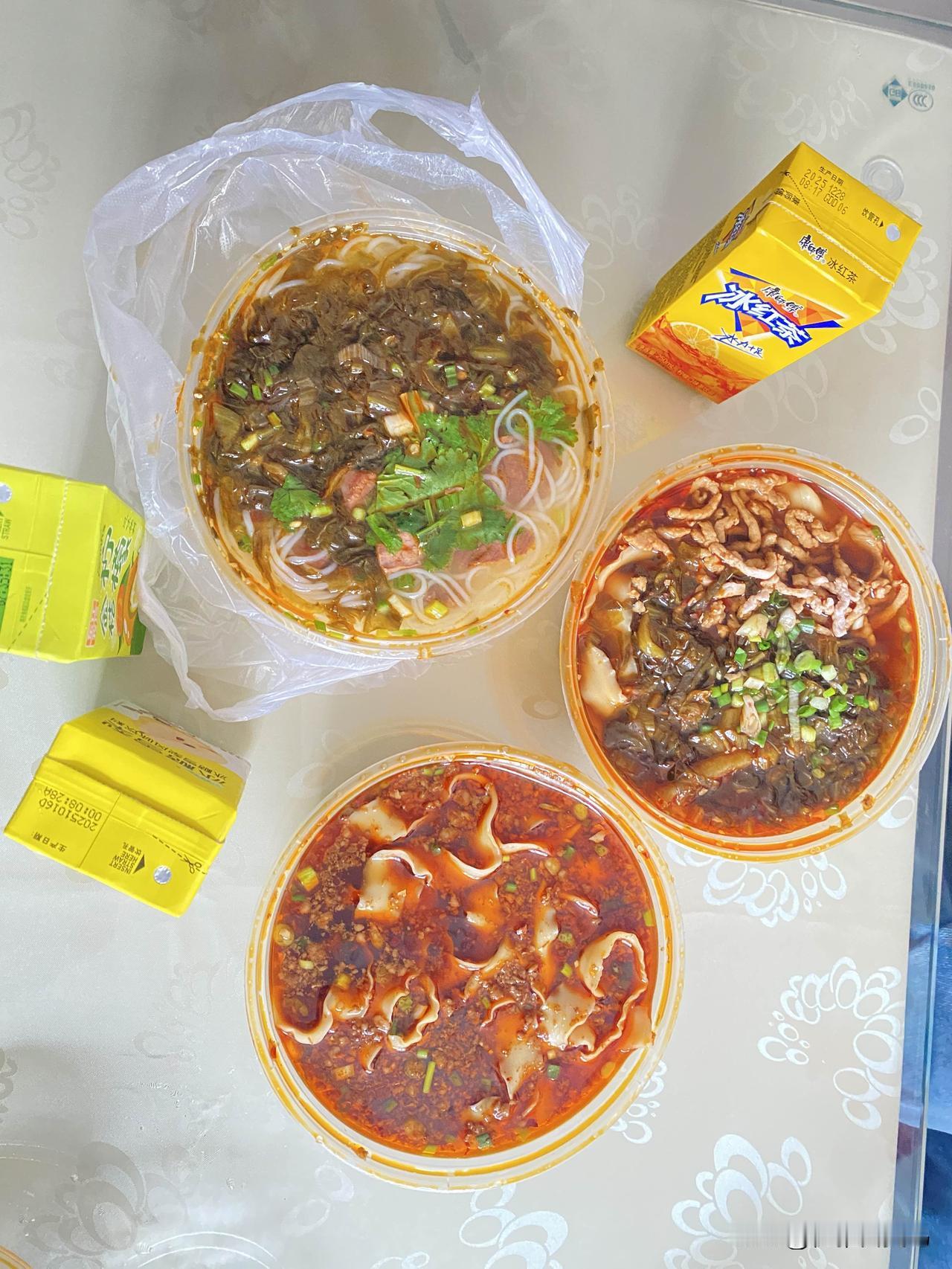 今天外面冷得让人直打哆嗦,实在不想在厨房折腾了。中午直接打包了三份粉面回来,给孩子们一人安排一碗。 我这碗是酸菜肉丝米粉,上面的酸菜和香菜看着就香。姑娘点的是刀削面,红亮亮的汤汁裹满了面片。小女儿那碗是牛头酸菜米线,肉给得特别足。再配上几盒饮料,跟孩子们围在桌子旁吃得热火朝天。 一碗下肚,浑身都暖和了,这就是最简单的幸福。