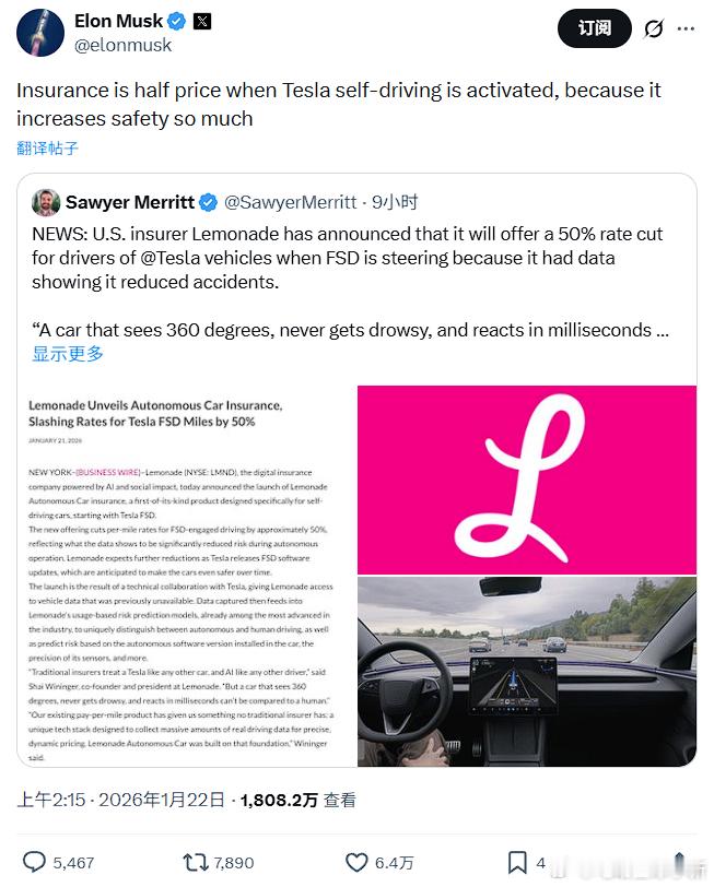 美国数字保险公司 Lemonade 推出全球首款面向自动驾驶的汽车保险,对特斯拉启用 FSD 行驶的里程提供约 50% 的单英里保费折扣。按里程精细划分驾驶场景,FSD 越安全保费越低。马斯克在 X 上表示:“当特斯拉自动驾驶功能激活后,保险费减半,因为它大大提升了安全性。”特斯拉FSD汽车保险