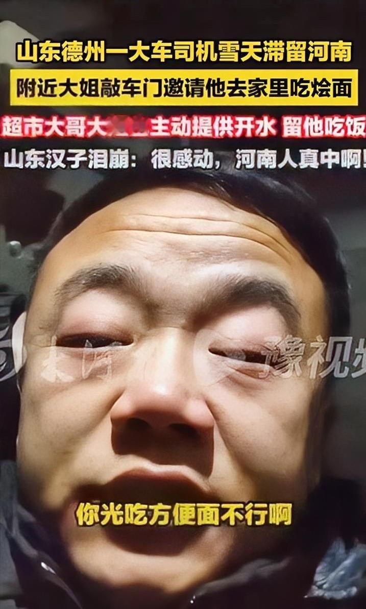 泪目了!河南南召,一司机因大雪被困,车辆无法行驶,只能在车内睡觉。谁知,一位大姐见司机不易,主动敲门,邀请司机去家里吃饭,司机感觉不好意思,无奈拒绝,而当他走进一家超市时,超市大哥的热心举动直接让司机泪目了。 这一回,真的是让一位七尺男儿泪洒当场!时间回溯到1月19日,来自山东德州的货运司机李师傅(网名“小飞哥”),驾驶着装满钙粉的重卡行驶至河南南召县皇后乡附近时,遭遇了恶劣的风雪天气。 车辆在一处坡道上寸步难行,轮胎不仅打滑还险象环生。天色渐暗,无计可施的他只好蜷缩在驾驶室里,准备靠吃方便面熬过漫漫长夜。 正当他打算就这样应付一宿的时候,车窗外突然响起了敲击声,原来是当地的两位热心大姐——王大丽和王京三找上了门。 "师傅,下这么大雪,去俺家吃顿热饭吧!"穿着黄棉袄的大姐满脸笑意地发出邀请。面对这突如其来的善意,李师傅下意识地摆手推辞,毕竟素昧平生,哪能厚着脸皮去打扰人家。 然而,旁边穿着黑棉袄的大姐紧接着说出的一番话,瞬间击中了他内心最柔软的地方:"俺家也有人开大车跑长途,这苦俺们懂!雪天里吃口热饭才暖和!" 尽管李师傅依旧出于礼貌再三婉拒,但大姐的态度却异常坚决:"那你等着,俺回去给你做碗烩面送过来!" 话音刚落,大姐便转身离去。望着她们的背影,李师傅呆坐在座位上,眼眶不知不觉湿润了。 过了一阵子,他打算去附近的小超市买点补给品顺便买点东西回礼。刚进门,超市的老板见他这身行头,立刻开口询问:"兄弟,开大车的吧?被困了?" 李师傅默默地点了点头。 没想到老板极其豪爽,张口就说:"来来来,我给你倒杯热水,晚上就在这吃饭,我给你炒几个菜暖和暖和,光吃方便面哪行!" 此时此刻,这位常年奔波于大江南北的硬汉再也控制不住情绪,滚烫的泪水夺眶而出。 更令他始料未及的是,当他在王大丽大姐家吃完了热气腾腾的羊肉炝锅面,刚回到车上休息时,又遇到了暖心的一幕。一家三口出门散步路过此地,特意敲着车门关切地问道:"师傅,吃饭了没?需要开水不?" 那个雪夜,李师傅躺在狭窄的铺位上辗转反侧,久久无法入眠,脑海中不断浮现出这些陌生河南老乡真诚的笑容。 次日清晨,天刚蒙蒙亮,心怀感激的他便悄悄起床,将王大丽家门前的积雪清扫得一干二净。而王大丽心里也记挂着这位外乡人,一大早就安排妹妹备好了饭菜,只等他过来用餐。 李师傅将这一连串的暖心遭遇录成视频发布到了网络平台,他在镜头前哽咽着感叹:"河南人真中!跑车这么多年,头一回遇到这样的情况......" 这条饱含深情的视频瞬间引爆网络,登上了热搜榜单。 评论区里,无数货车司机纷纷留言表达强烈的共鸣:"我跑河南十来年了,河南人就是中!""走过南闯过北,最喜欢河南人!""在河南要是让你饿着了,那是我们的责任!" 这一声声响亮的"中",正是无数常年奔波在路上的司机们,用实际行动和切身体验投出的信任票。 究其原因,王大丽之所以如此古道热肠,是因为她的亲弟弟也是一名卡车司机,她深知这种被困途中的辛酸与无助。而那位超市老板之所以主动挽留陌生人吃饭,也是因为看不得风雪中那些孤单瑟缩的身影。 这便是世间最质朴的共情,不掺杂半分功利色彩,仅仅是源于内心深处那份不忍看他人受苦的善良。 各位朋友,这种温暖人心的善意在您的家乡常见吗?欢迎在评论区分享您曾亲身经历过的那些暖心瞬间! 参考信息:大雪封路山东司机滞留,河南姐妹暖心相助,一顿热饭和清晨扫雪的双向奔赴 2026-01-22 08:53·半岛网