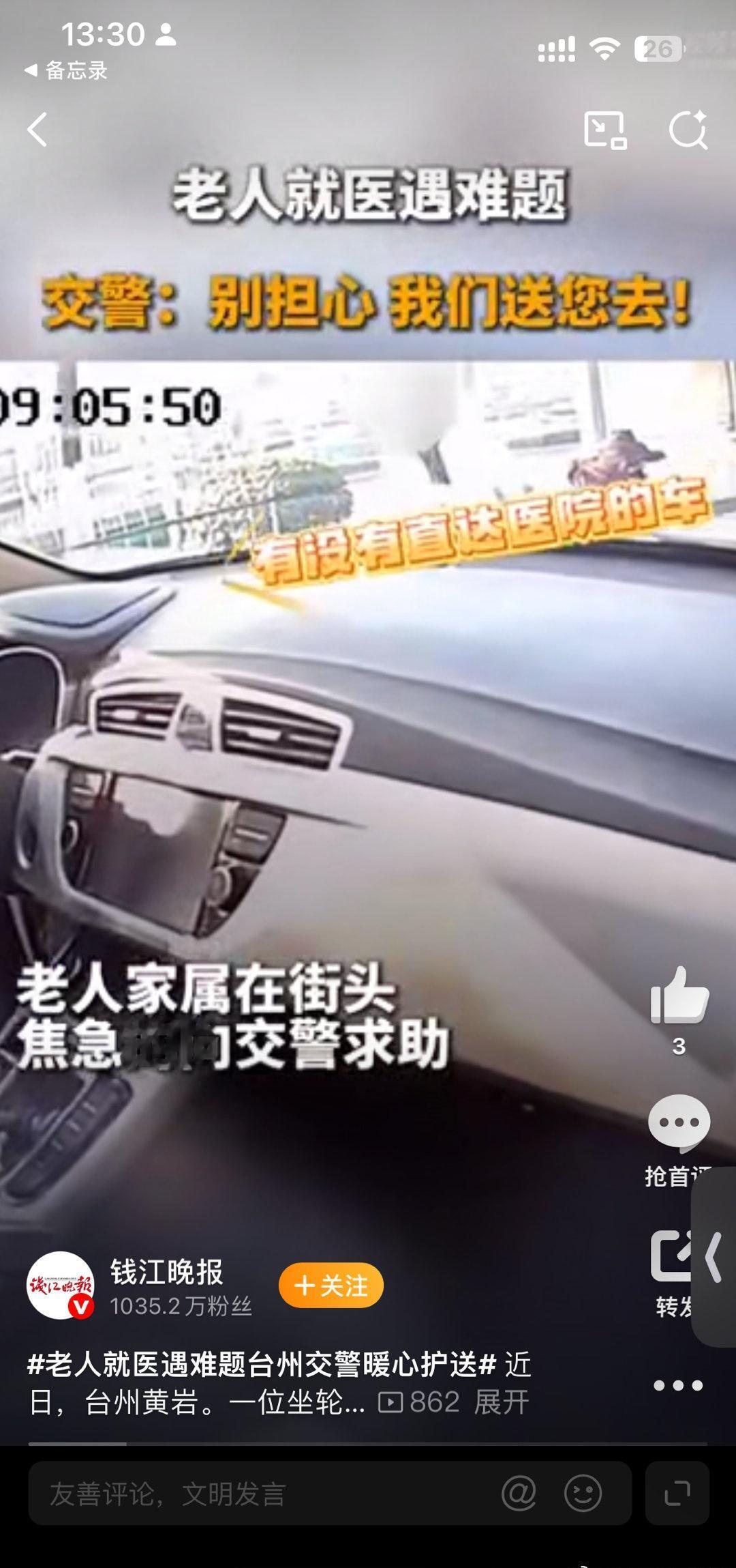 嗨hay的鱼塘超话老人就医遇难题台州交警暖心护送 真正的温暖,总在细微处闪光!感