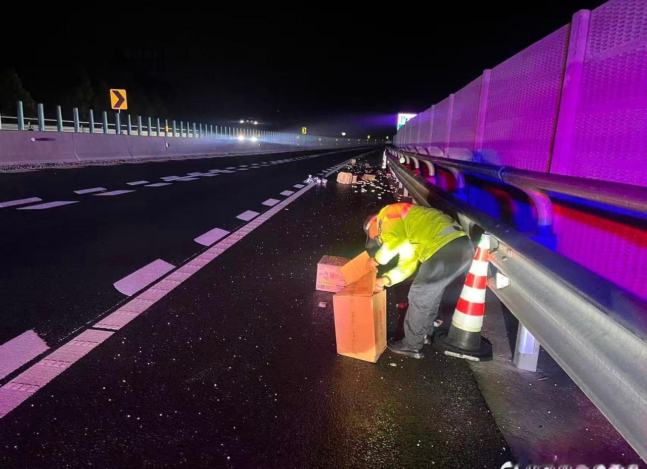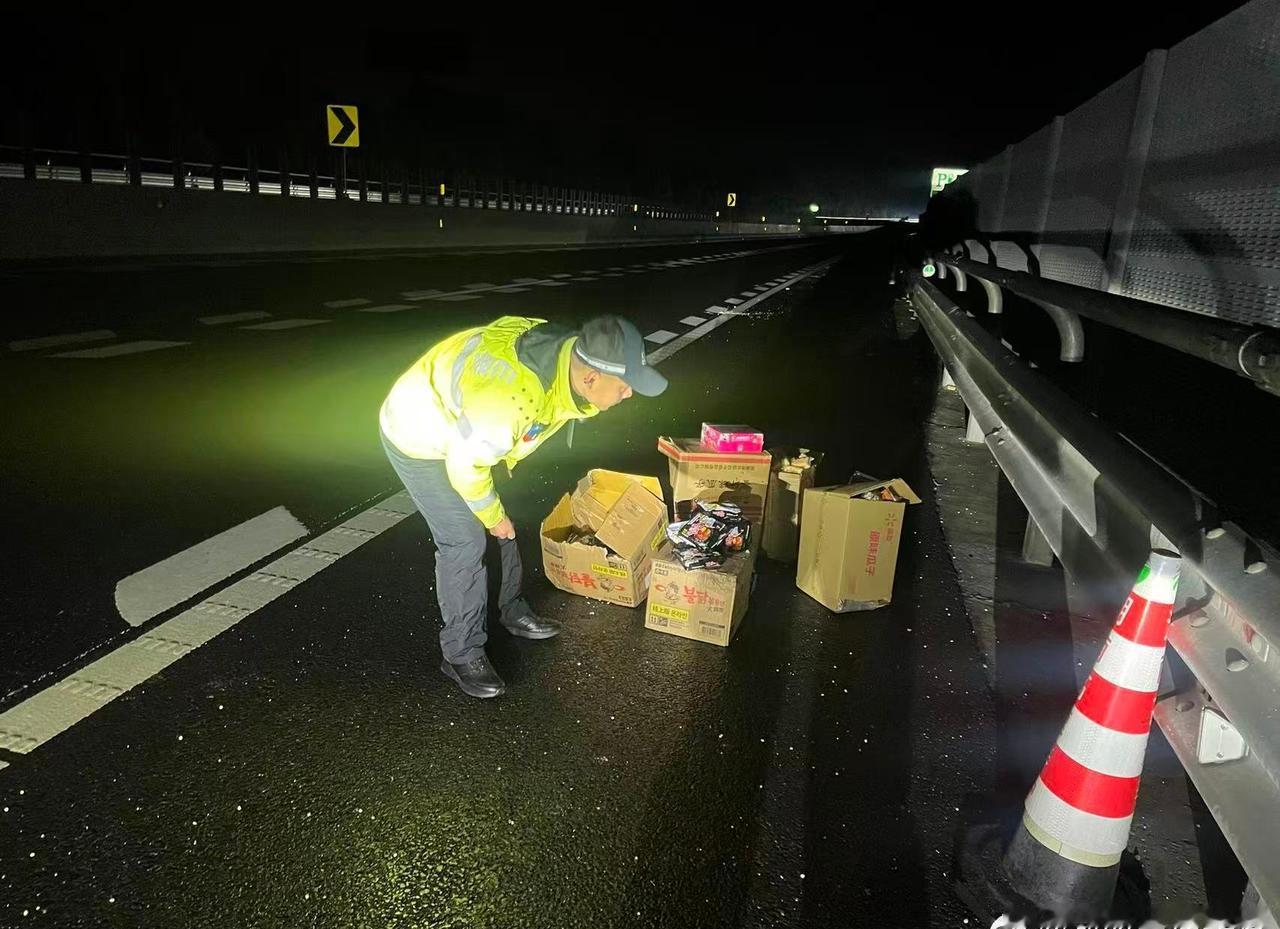 1月20日23时许, 安江大队值班室接到报警称其在往东离安江服务区大约两公里的位置,由于车辆篷布的绳子松脱,导致掉落了一些货物,请求民警出警处理,大队接警后立即指派就近巡逻警力前往处置,23时55分许,民警在沪昆高速1409公里处找到一些散落货物,经清理装箱后,民警将捡回的六七件货物在往东安江服务区交还给驾驶员,帮助驾驶员挽回了部分损失,驾驶员对民警的处置速度和为民情怀表示肯定和感谢。