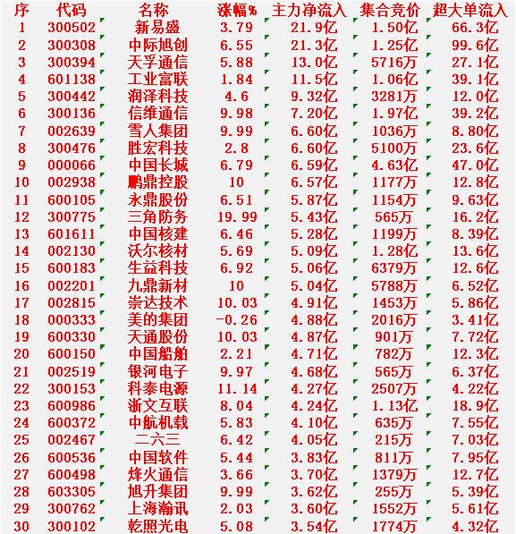 1月22日收盘,主力资金,已经大幅卖出的30名单: 三花智控:净流出 24.1亿元 通富微电:净流出 17.2亿元 兆易创新:净流出 14.9亿元 宁德时代:净流出 14.1亿元 立讯精密:净流出 11.2亿元 长电科技:净流出 10.2亿元 华天科技:净流出 9.39亿元 阳光电源:净流出 9.31亿元 特变电工:净流出 9.27亿元 蓝思科技:净流出 8.97亿元 1月22日收盘,主力资金“大幅买入”的30名单: 新易盛:净流入 21.9亿元 中际旭创:净流入 21.3亿元 天孚通信:净流入 13.0亿元 工业富联:净流入 11.5亿元 润泽科技:净流入 9.32亿元 信维通信:净流入 7.20亿元 雪人集团:净流入 6.60亿元 胜宏科技:净流入 6.60亿元 中国长城:净流入 6.59亿元 鹏鼎控股:净流入 6.57亿元 永鼎股份:净流入 5.87亿元 三角防务:净流入 5.43亿元 中国核建:净流入 5.28亿元 沃尔核材:净流入 5.09亿元 生益科技:净流入 5.06亿元 九鼎新材:净流入 5.04亿元 崇达技术:净流入 4.91亿元 美的集团:净流入 4.88亿元 天通股份:净流入 4.87亿元 中国船舶:净流入 4.71亿元