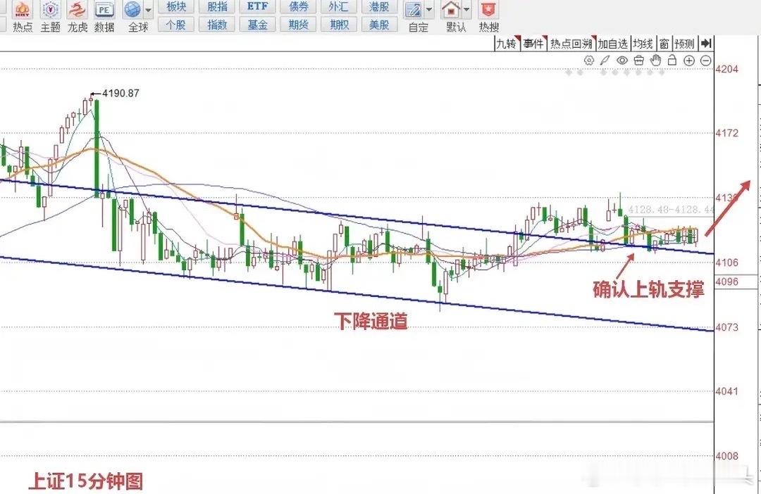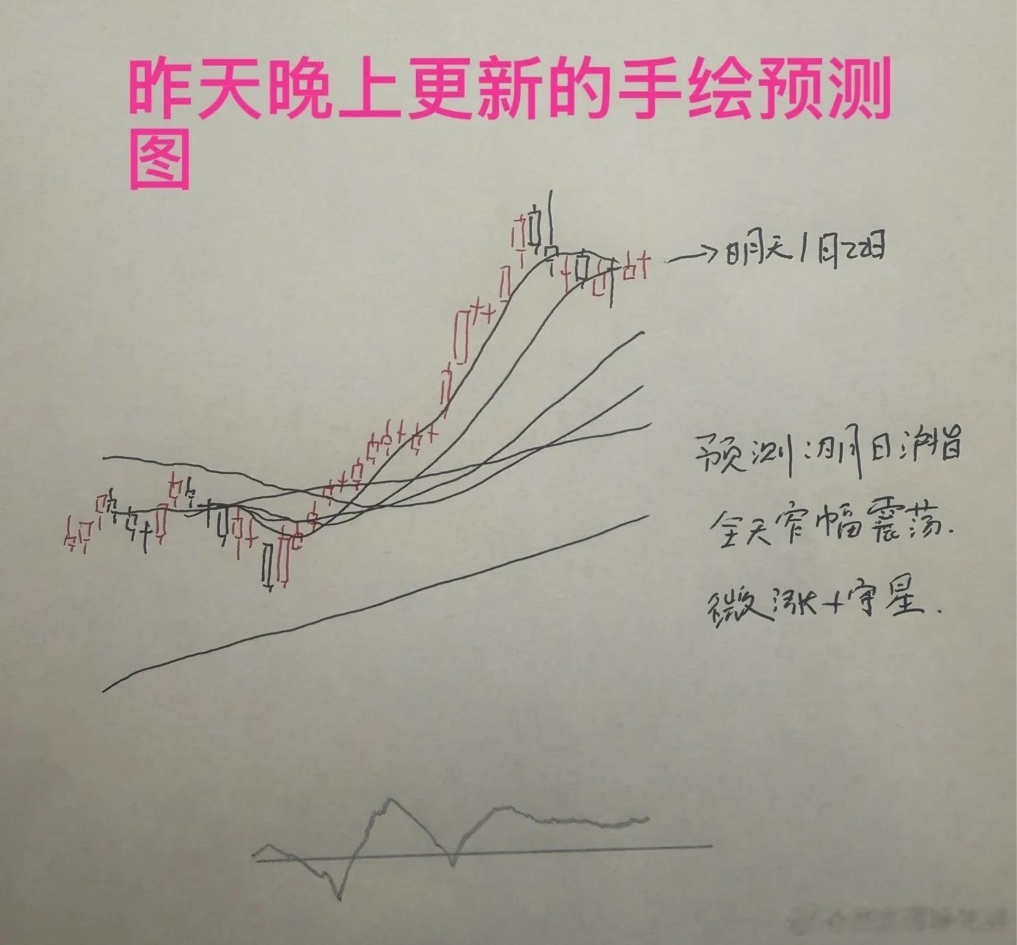 收评: A股如期微涨十字星,权重压制节奏何时结束?莎莎今天拿下70分从今天市场的实际走势来看,与莎莎的预判基本上还是差不多的,只是呢略微遗憾的是,今天市场走的是假阴十字星,而我昨天晚上的判断是阳十字星。大家请看图一我昨天晚上更新的手绘预测图,与今天的市场实际走势其实是非常相似的,只是颜色不同而已。而今天市场实际上还是属于小幅上涨,并且上涨的家数有3577家。所以今天这个判断,打70分应该是问题不大。我相信大家也没有意见。回答问题的重点 A股放量微涨十字星,接下来怎么看? A股今天盘中多次翻红的情况下,被上证50指数压制节奏,多次再翻绿!这种主力控节奏的走势何时结束?接下来莎莎给大家讲3点听完这3点之后,大家就明白接下来市场怎么走,以及咱们怎么应对了:第一,从今天市场收盘的情况来看,市场始终运行在上周星期天我就和大家讲到的,整体的碟形结构当中。大家请看图二。看完下图之后,大家就知道碟形结构是什么了。一般这种碟形结构完成之后,在蝶形结构的右手边,将会出现新的一轮上涨波段。所以接下来整体指数继续维持相对乐观判断。第二,上证50指数,今天多次出现明显分时级别的杀跌动作。我们可以看到每次大盘的翻红,基本上都是由上证50指数压回来的。那么上证50指数,到今天为止,已经实现了日线8连跌。这种压制盘面的动作,什么时候会结束呢?根据莎莎观察上证50指数从阶段的拐点开始到今天为止大家请看图三,已经运行到第12个交易日,明天将是第13个交易日,也就是说明天将会到达第13天斐波纳契变盘时间窗口,那么我的判断是,明天上证50大概率就会结束这种压盘的动作。第三,整体上证指数今天虽然盘中多次出现,反反复复的走势,但是从图四上证指数15分钟k线图来看,15分钟级别,突破下降通道之后,目前反复确认了15分钟级别通道上轨的支撑。预计明天市场有望展开15分钟级别的上涨浪。所以综合以上分析,对于明天市场指数,我依然维持乐观的判断,而且今天市场的走势也基本符合我的预判,并且目前看来市场还在我预判的路径当中,继续往前走。有什么新的观点,我会第一时间告诉大家。关于明天走势的手绘预测图,我将会在稍晚一点更新,兄弟姐妹们点赞就是对我这个纯技术派的最大支持。