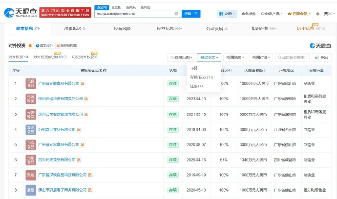 【袁记云饺创始人商业版图盘点袁记云饺创始人名下关联12家企业】据媒体报道,近日,袁记云饺的运营主体袁记食品集团股份有限公司在香港联交所递交了上市申请。华泰国际与广发证券共同担任联席保荐人。本次募资主要用于数字化建设、建设海外供应链并拓展海外市场、品牌建设与产品研发等。天眼查工商信息显示,袁记食品集团股份有限公司成立于2017年4月,法定代表人为创始人袁亮宏,注册资本约1.2亿人民币,经营范围包括食品销售、食品生产、互联网直播技术服务等。股东信息显示,该公司由广东省袁记投资有限公司、袁亮宏、佛山市探未知企业管理合伙企业(有限合伙)等共同持股。对外投资信息显示,该公司对外投资14家企业,其中13家处于存续状态,包括广东省元顺食品有限公司、深圳元域投资有限责任公司等。任职信息显示,袁亮宏名下关联12家企业,其中10家处于存续或者开业状态,包括广东省袁记投资有限公司、湖南省袁记文化旅游发展有限公司等,袁亮宏在上述公司担任执行董事、经理等职务。90后体育生卖饺子年入25亿