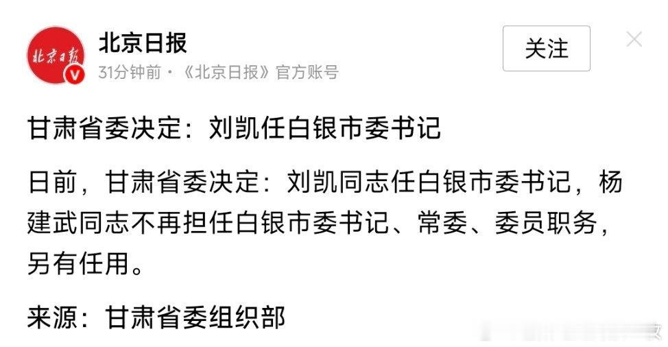杨金泉任天水市委书记;刘永革任陇南市委书记。