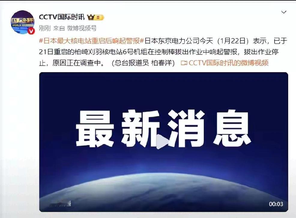 怎么就这么不争气? 1月22日,日本东京电力公司宣布,最大的核电站响起警报,停止作业,原因正在调查中。 个人预判:日本军国主义分子气急败坏的宣称:“怎么就这么不争气?败家玩意。这不是给争夺选票的日本女执政者带一个有国际影响力的眼罩吗?扇了一个震天响的耳光吗?马上鞠躬道歉,就无用负责了。” 本来就是一个不适合建核电的国家,偏偏要发展这么多的核电,深层原因就是预谋拥有核武器, 再度“再军事化”。