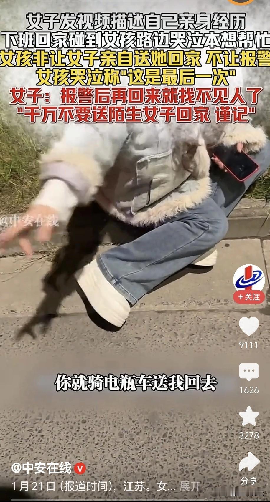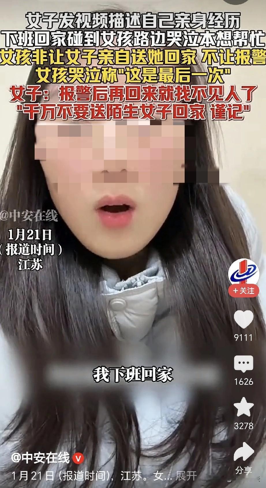 千万不要送陌生女子回家!江苏,一女子晚上回家,遇到一小姑娘在路边哭泣,女子问她有没有事,需不需要帮她拨打报警电话,谁知小姑娘越发哭的厉害,不让报警也不让给她叫车,非要女子骑电动车送她回家,姑娘边哭边说:“这是最后一次”,女子出于谨慎,还是报警了,警方赶到,发现小姑娘已经跑不见了,女子吓出冷汗: 千万不要送陌生女子回家,谨记!谨记! 1月21日,有媒体报道,一女子发布了视频,讲述了自己的亲身经历。 女子晚上下班,她一看时间,已经是傍晚9点多了。 女子收拾好了东西,匆匆就往家里赶去,路边的行人眼看着已经少了,她心里焦急,越发希望能够快一点到家里。 谁知她正往前行,突然就看到路边的草坪上,有一个小姑娘趴在那里哭泣。 女子不知发生了什么,这黑天半夜的,她怕小姑娘遇到了难事。 女子出于好心,拿出手机慢慢朝姑娘走了过去,谁知那姑娘看她走来,越发是哭的声音大了。 女子走到小姑娘的身旁,小心翼翼的问她:“你有没有事?要不要我帮你打个电话?” 那姑娘听到声音,立刻转身看向女子,她一看是一位姐姐,立刻把手伸了过来,看她那个样子,大概是想拽住女子。 女子低头一看,那姑娘穿着棉衣,牛仔裤,白鞋子,她哭的很凶,看起来像是受到了委屈。 女子赶忙就问她: 你怎么了?要不要我帮你打个电话? 谁知那女孩哭着说,不要不要,你送我回家行不行? 女子有些警觉起来,这天都黑了,谁知道你家在哪里,你这是要干啥? 女子想罢,立刻又问她:你咋了?你家在哪里啊? 那姑娘只重复着一句话: 我要回家,你送我回家行不行? 女子又问,你是哪里不舒服吗?可姑娘依旧重复那一句话: 你能送我回家吗? 女子更加警觉的起来,问姑娘家住哪里? 那姑娘说了个地址,女子连忙对小姑娘说: 要不我帮你打个报警电话吧。 谁知那姑娘拒绝: 不要不要,你送我回家好不好? 女子立刻说道,我给你打个车好不好? 那姑娘急了,她呜呜咽咽,一副可怜的样子,她不要给她叫车,还是坚持要女子送她。 她带着哭腔: 你送我回家,我的房间号是某某某,求求你送我回家好不好? 女子这时候已经开始害怕,你是个女的,我也是个女的,你害怕,我也害怕呀! 女子要帮她报警,谁知姑娘声都变了,她慌里慌张: 不要报警!你送我回家! 这个时候,女子已经感觉到了危险的味道,她想离开,立刻对那姑娘说道: 我不敢送你回家! 姑娘哭着求她:“你相信我,这是最后一次……” 女子往四周看看,这个时间,天已经晚了,路上空荡荡的,只有几个石墩子在一旁摆着,还有几辆电动车停在路边。 老远处似乎有个公交站牌,霓虹灯闪着,可是无人路过,女子汗毛都立起来了。 她告诉那姑娘,我不敢送你回家,我可以叫一辆车送你回去。 可是那姑娘依旧纠缠,她用手一指: 不要,你就骑那边的电动车送我回家…… 女子无言了,我送你回去,我也不敢的…… 女子一边怀疑,一边拨通了报警电话,不大一会,警方就赶到了现场。 由于那边天黑,已经看不清楚,女子上前迎着民警,随后,她带民警赶到姑娘刚才哭的地方。 可谁知道,就十几秒的功夫,那里已经没有人了。 那个哭泣的小姑娘跑了,女子一阵后怕,她想起来在新闻上看到的那些报道,那些骗子假装可怜,哄着别人去帮助他们。 然后再将好心人领到无人处,到了那里,想跑也跑不了了。 女子后怕不已,她发出了视频,把自己经历讲述了出来,最后她百般的叮嘱大家: 谨记谨记,千万不要送陌生女子回家! 太吓人了!这事本身就透着诡 异,这小姑娘既然知道自己家,为啥却一直让别人送她回家? 路边停着电动车,你自己去骑呀,干嘛非要别人骑车送你回家? 看她那个样子,也不是个儿童,已经成年人的模样,她自己的左手还拿着手机,难道她自己不会报警吗? 既然姑娘一再表示,非要让路遇的女子送自己回家,为何又坚决反对女子报警?? 既然自己想平安回家,那让民警送不是更安全吗? 事实说明,遇上不明身份人遇难,可以打电话报警,但是自己千万别单独做好事,万一自己有了事情,万劫不复,一个家庭都要毁了。 发视频的女子人善心美,她还是不忍心把姑娘单独丢下。 大概她心里害 怕,万一是自己误解了对方,万一是对方真的遇到了难处? 女子最后选择了报警,也是非常的聪明,有事就找帽子叔叔,如果真是有事,叔叔也会给她帮助。 我们可以善良,但是绝对不能盲目的善良,毕竟啥人都有,你根本就不知道对方是啥样的人,又是抱有何种的目的。 即便是帮人,也要先保护好自己,毕竟自己也是妈妈的女儿,是孩子的母亲,是自己家人的至亲,万一有事,我们赌不起的。 对此,你怎么看?欢迎评论区留言讨论。