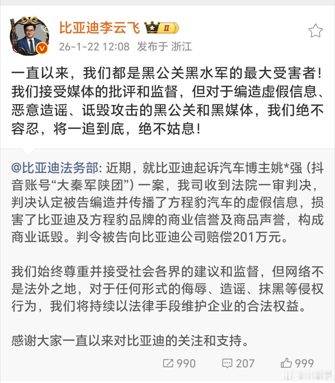 方程豹胜诉姚十八,造谣抹黑终需担责!1月22日比亚迪法务部公告,起诉姚*强(姚十