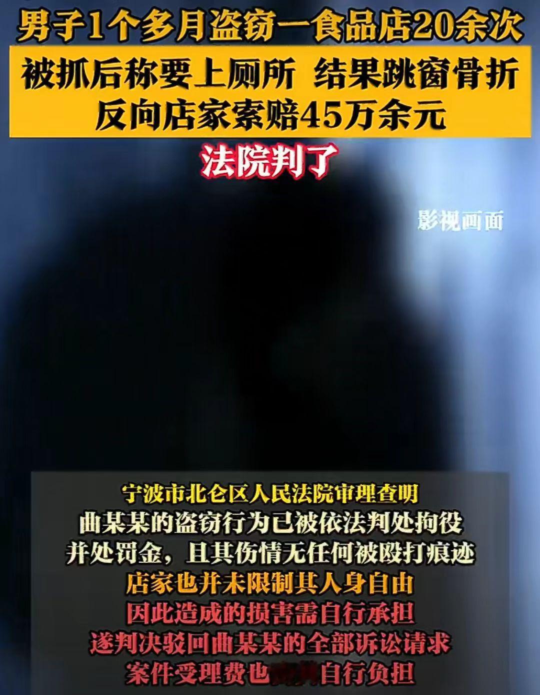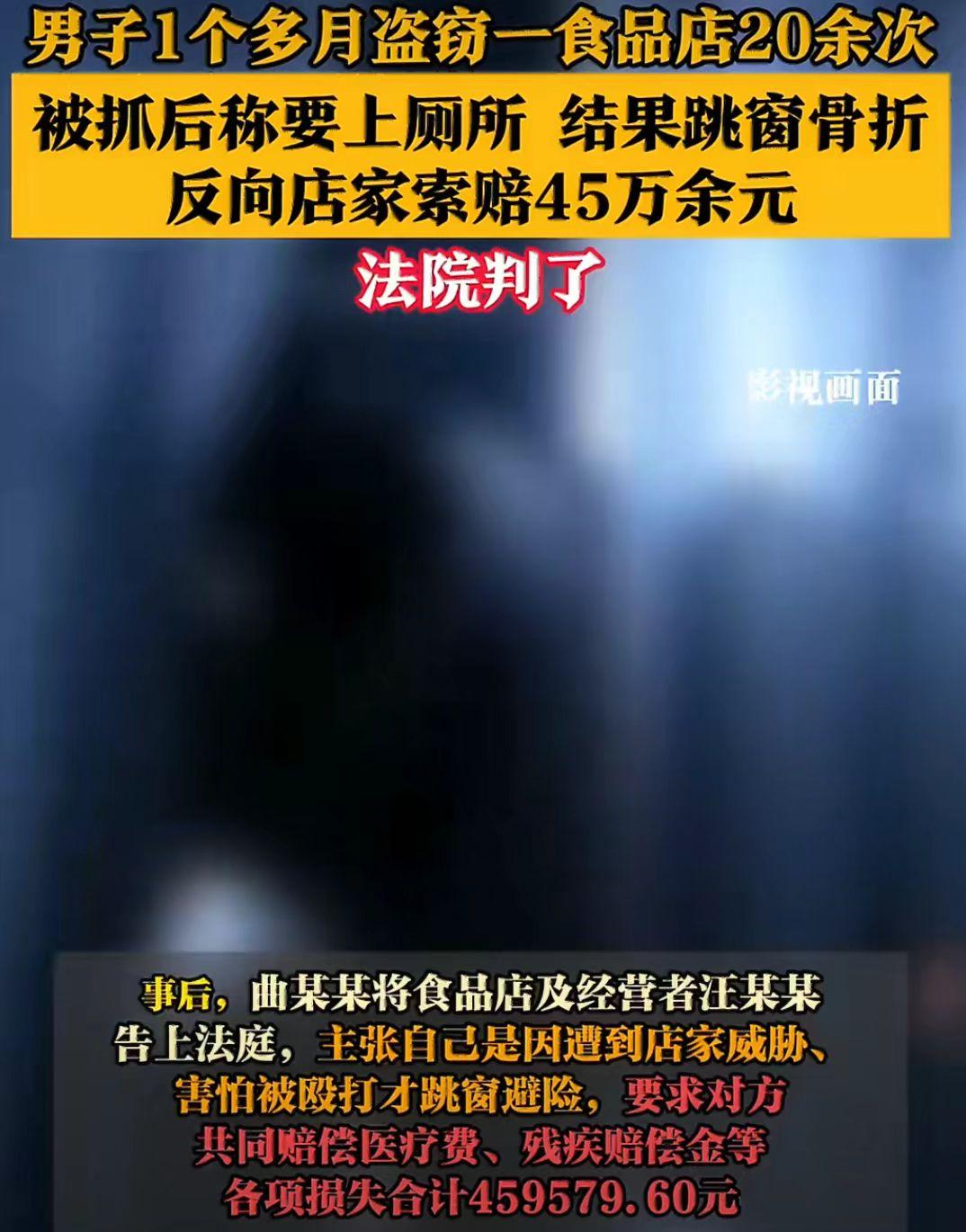 宁波市北仑区,一男子曲某某偷了某食品店20多次。 被老板抓到后,逃跑摔断了腿,曲某某认为是老板的错,就把老板给告了,要求老板赔偿45.9万。 2023年8月31日至10月2日,曲某某在宁波一家食品店盗窃了20多次,最终被老板抓住了。 被老板抓到后,老板也没有报警,想着让曲某某把钱还了,就算了。 被抓后曲某某也没有特别害怕,就和老板说想上个厕所,老板也没多想,就同意了。 结果曲某某在上厕所时,跳窗逃跑了,曲某某最终逃跑没成功,摔成了骨折。 曲某某觉得自己之所以摔成骨折,都是老板害的,就把老板给告了,要求老板赔偿45.9万。 离谱,简直不敢相信,偷窃逃跑摔断了腿,还能怪上老板了。 曲某某说:“害怕被殴打”为主张跳窗逃跑属于紧急避险,符合民典法182条。意思是自己逃跑是因为怕老板打他,不是不想赔钱。 法院审理认定:查明曲某的盗窃行为已被依法判处拘役并处罚金,且其伤情仅有跟骨骨折,无任何被殴打痕迹;店家不仅未限制其人身自由,在其如厕时也未进行跟随。 曲某某造成的损害需自行承担,判决驳回曲某某的全部诉讼请求,案件受理费也由曲某某自行承担。 案件偷窃 偷窃能有多离谱 逃跑