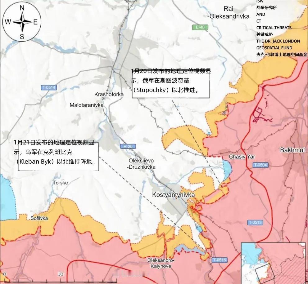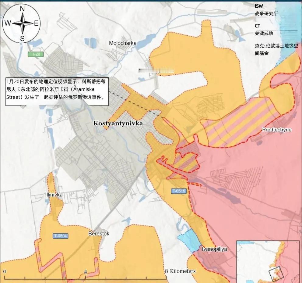 决战双子城之外围争夺:俄军在康斯坦丁诺夫取得关键进展 1月20日至21日,俄军在利曼-斯拉维扬斯克轴线展开宽正面进攻,覆盖利曼本体及周边多个关键节点,形成多点牵制、重点突破的战术布局。 乌克兰无人机系统部队营在斯拉维扬斯克方向的作战报告显示,俄军持续试图夺取德罗尼夫卡,并向扎基特内、克里维伊卢卡(斯拉维扬斯克东)推进,但乌军已掌握俄军地面补给线的火力控制权,迫使俄军要么进行长距离机动补给,要么乘摩托车、全地形车穿越乌军杀伤区实施渗透,大幅削弱俄军进攻效率。 俄军战斗序列方面,第7摩托化步枪旅持续在扎基特内、锡韦尔斯克部署作战;鲁比孔先进无人机技术中心、第16特种旅(俄罗斯总参谋部格鲁乌)的无人机操作员及特种力量则投入利曼方向,强化侦察与精准打击能力。此外,俄军事博主发布未证实消息称,俄军已在扎基特内东南(斯拉维扬斯克东北)取得推进,进一步压缩斯拉维扬斯克东北防御空间。 康斯坦丁诺夫卡作为双子城外围的战略枢纽,成为俄军1月20日至21日进攻的核心突破口,俄军发起九路并行突击,形成对康斯坦丁诺夫卡的全方位包围式进攻。 1月20日发布的地理定位影像证实,俄军在斯图波奇基(康斯坦丁诺夫卡东)以北、T-0504康斯坦丁诺夫卡-波克罗夫斯克公路北侧取得近期推进,这是康斯坦丁诺夫卡方向首个经地理定位验证的实质性战果,撕开了康斯坦丁诺夫卡东部防线的缺口,为后续向康斯坦丁诺夫卡本体推进奠定基础。 1月20日至21日的地理定位影像显示,乌军对康斯坦丁诺夫卡东北及伊林尼夫卡南(康斯坦丁诺夫卡西)的俄军渗透部队实施打击,美国战争研究所认为,此次俄军渗透行动虽未改变地形控制与战线前沿,但体现了俄军持续的战术渗透能力,持续消耗乌军兵力与火力,为正面进攻创造条件。 1月21日的地理定位影像显示,俄军第103摩托化步枪团第2摩托化步枪营的无人机操作员,对克莱班-别克(康斯坦丁诺夫卡南)以北的乌军阵地实施精准打击,印证了俄军此前宣称的该区域存在,进一步巩固康斯坦丁诺夫卡南部的战术存在。此外,俄军事博主发布未证实消息称,俄军已在新帕夫利夫卡东(德鲁日基夫卡西南)推进,拓展康斯坦丁诺夫卡西南方向的进攻纵深。 为保障康斯坦丁诺夫卡方向的进攻优势,俄军投入多支精锐部队,形成地面突击+无人机打击+炮兵支援的立体作战体系(部队战斗序列不再一一罗列)。