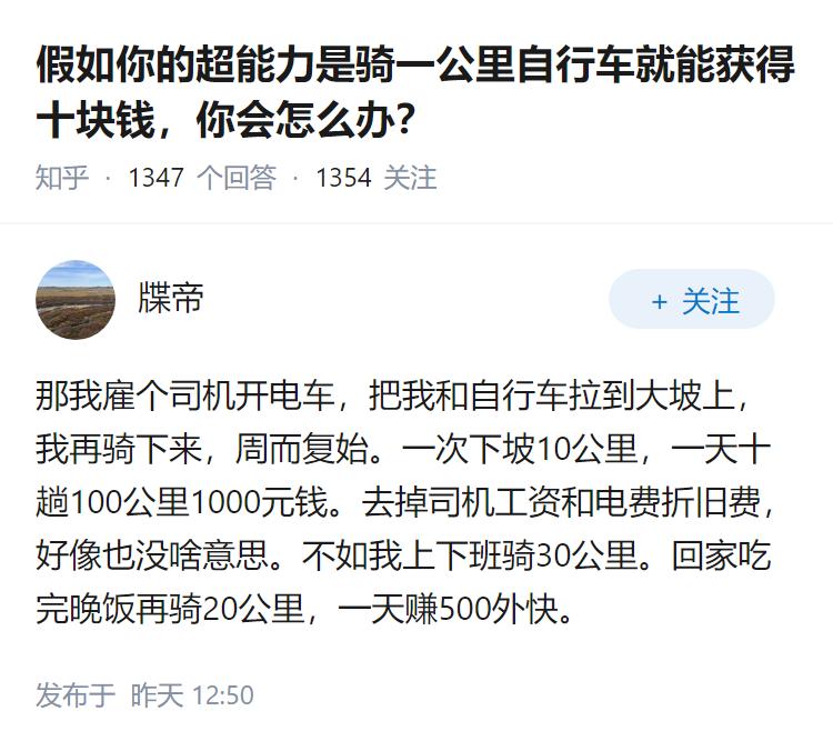假如你的超能力是骑一公里自行车就能获得十块钱,你会怎么办?