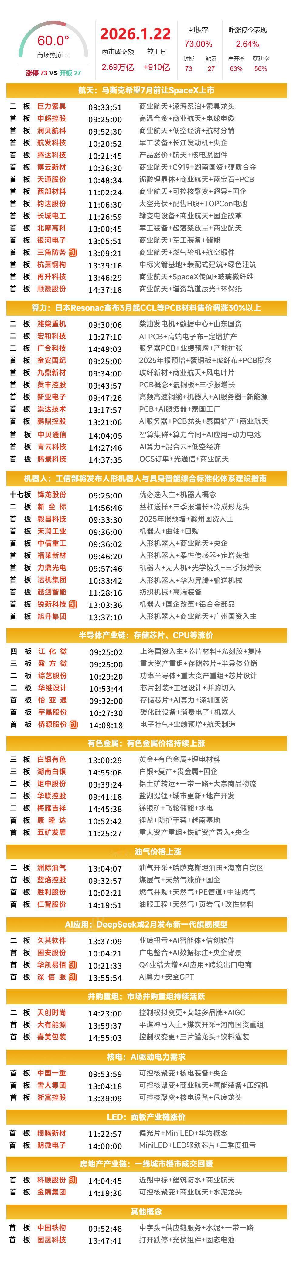 1月22日涨停复盘|商业航天概念爆发,机器人概念反复走强,油气天然气、PCB