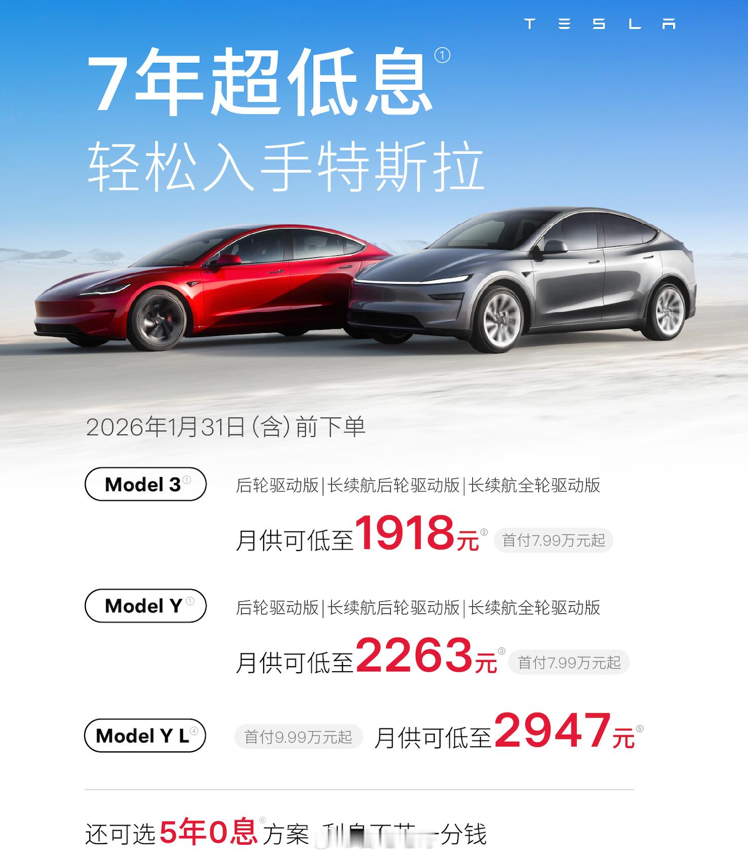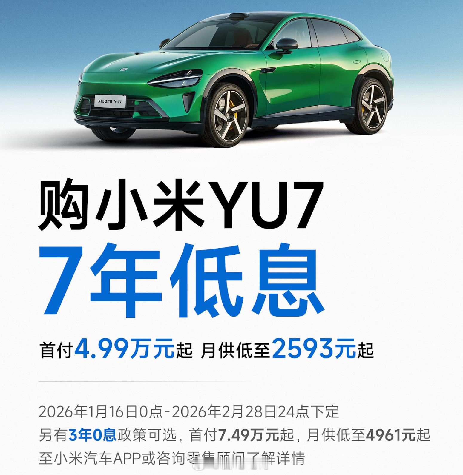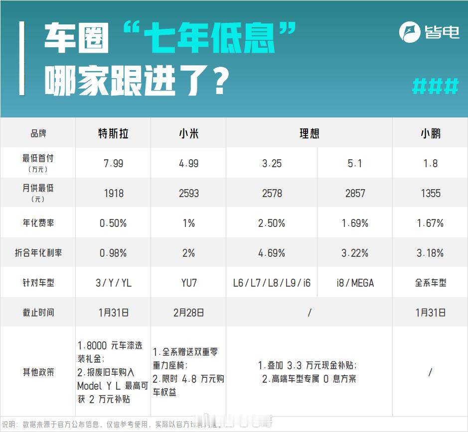多家车企推出七年低息购车方案 相信大家最近都有了解到“七年分期”。1月6日,特斯拉中国率先推出了限时7年(84期)超低息购车方案,年化利率低至0.98%,Model 3月供低至1918元、日供仅63元。这一举动就引发了连锁反应,众多车企紧随其后。政策落地十天后,从新势力到传统新能源品牌,都开始加入超长期阵营。最先反应过来的是小米汽车,紧接着理想、小鹏、东风奕派都加入了七年低息方案。短短半个月,7年分期从特斯拉的“独一份”,演变为新势力头部品牌的“标配玩法”,相信跟进的车企还会不断增加。为什么特斯拉会首先打出“七年分期大招”这张牌?这是迫于多重压力的战术。一、销量增长承压:2025年特斯拉全球交付163.6万辆,同比下滑8.6%,首次丢掉全球电动车销冠,其中在国内销量同比下滑7.37%,第四季度交付量更是同比下降15.6%,低于市场预期。二、政策环境倒逼:2026年新能源汽车购置税从全额免征改为减半征收,叠加以旧换新补贴政策调整,消费者购车成本被动上升,市场进入短暂观望期。正是这些多方压力下,特斯拉不得不以“七年低息”应对压力,而其他车企快速跟进,本质是“不跟进即掉队”的被动防御,更是主动抢占市场的战略考量。这场超长分期战的核心,正是瞄准了家用低预算客群的消费升级需求。这一客群原本以燃油车和入门级新能源为主,对购车成本高度敏感,而7年分期精准解决了他们“想升级、差资金”的痛点。总的来说:2026年开年的“7年分期”节奏,只是今年车市竞争的序章,接下来可能会出现更多免息或者零首付等激进的方案。对于车企来说,单纯以来金融政策竞争很难长远发展,提升自家产品竞争力才是硬实力。而对于消费者来说,今年或许是购车的好时机,但是也要切记不要冲动消费,保持理性,找到属于自己的最优方案。七年分期大V聊车