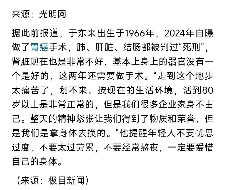 于东来竟然有胃癌,肺、肝脏、结肠、肾脏都不好!看平时精气神,一点看不出来,60岁像年轻人玩越野,还跳入冰冷河水里,帮助越野朋友,施救被困车辆,真是无论何时无论何地,都是一副热心肠!心态好,必爱做善事,也是一种信仰与福报,祝福于东来健康身体,生活多姿多彩!