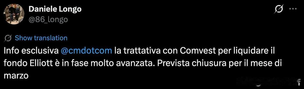 米兰易主即将完成!不对,应该说米兰债主易主即将完成,红鸟集团与埃利奥特集团谈判已经进入最后阶段,预计三月份米兰会完成与埃利奥特集团的分割。 隆戈貌似特别看好这次易主,之前那个加拿大卖保险的公司还没啥消息的时候隆戈就一直在报道米兰的新金主,隆戈就说新的债主不会干涉米兰任何运营,他们相信卡迪纳莱能成功运营米兰,能为公司带来丰厚的收益。 个人觉得米兰的交易有很多不可告人的秘密,前段时间高炮曾经准备债转股,然后参与新球场的融资,本来都已经皆大欢喜了,这个时候被小摩根叫停了,当时消息是摩根大通叫停红鸟集团与埃利奥特集团谈判,这个事情能理解,红鸟集团与埃利奥特集团在摩根大通面前就是小卡拉米,个人觉得米兰的那个神秘股东也许就是摩根大通,之前一直说米兰有七个股东,但陆续爆出来的只有六个,第七个股东很神秘,没人知道是谁,摩根大通之前一直都是米兰债主,但从来没有报道红鸟集团偿还摩根大通贷款或者利息,也没有摩根大通与米兰贷款具体细节,也许当年摩根大通贷款就是转化为股权了。