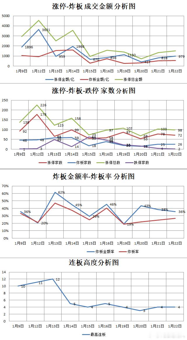 【1.22星期四】 湖南人涨停复盘 "涨停金额:979亿 炸板金额:545亿首板金额:734亿 连板金额:245亿涨停72家 炸板26家 跌停2家首板56家 连板16家" 【市场连板股】16只 245亿 代码 名称 末次时间 连板数 原因002931 锋龙股份 9:25 4 机器人603078 江化微 9:25 3 国产芯片000670 盈方微 9:25 3 国产芯片601212 白银有色 13:00 3 有色金属000880 潍柴重机 9:30 2 AI硬件002342 巨力索具 9:33 2 商业航天001202 炬申股份 9:39 2 有色金属000036 华联控股 9:41 2 有色金属600770 综艺股份 10:29 2 国产芯片600759 洲际油气 13:04 2 油气603256 宏和科技 13:27 2 PCB002279 久其软件 13:37 2 公告603608 天创时尚 14:23 2 股权转让600868 梅雁吉祥 14:45 2 有色金属001389 广合科技 14:49 2 PCB603040 新坐标 14:56 2 机器人【商业航天】24只 322亿 消息面: 马斯克希望7月前让SpaceX上市 002342 巨力索具 9:33 2/11天6板 商业航天002471 中超控股 9:25 1 航空航天+机器人002201 九鼎新材 9:34 1/7天4板 商业航天601608 中信重工 9:36 1 商业航天+机器人001316 润贝航科 9:52 1 航空材料601106 中国一重 9:53 1/12天6板 可控核聚变股东+商业航天600391 航发科技 10:20 1/4天3板 大飞机+航空发动机001379 腾达科技 10:21 1 商业航天002943 宇晶股份 10:27 1 卫星玻璃(切割设备)002297 博云新材 10:36 1 国产大飞机600330 天通股份 10:48 1 光模块上游+商业航天002149 西部材料 11:02 1 网传SpaceX铌合金供应商002865 钧达股份 11:06 1 太空光伏600192 长城电工 11:26 1 商业航天002985 北摩高科 13:00 1/4天2板 国产大飞机+商业航天002519 银河电子 13:05 1/14天8板 参股格思航天300775 三角防务 13:09 1 大飞机+商业航天600477 杭萧钢构 13:39 1 中标箭元火箭项目603601 再升科技 13:46 1 SpaceX供应商603778 国晟科技 13:47 1 太空光伏(未证实)603220 中贝通信 14:04 1 卫星通信+算力300737 科顺股份 14:04 1 商业航天601992 金隅集团 14:19 1 商业航天002565 顺灏股份 14:37 1 太空算力【机器人】11只 61亿 消息面: 工信部:将发布人形机器人与具身智能综合标准化体系建设指南 002931 锋龙股份 9:25 4/25天17板 优必选拟入主603040 新坐标 14:56 2 丝杠送样+机器人002283 天润工业 9:36 1 AI智能体+工业机器人605488 福莱新材 9:46 1/4天2板 第三代电子皮肤605118 力鼎光电 9:57 1 机器人001288 运机集团 10:33 1 矿山智能工业机器人603665 康隆达 10:52 1 机器人(超高分子聚乙烯)603095 越剑智能 11:28 1 AI智能验布机+机器人300828 锐新科技 13:03 1 机器人603305 旭升集团 13:37 1 机器人轻量化603608 天创时尚 14:23 2 机器人+商业航天【国产芯片】7只 71亿 消息面: CPU概念股大涨;美光等表示AI热潮驱动“前所未见”的内存短缺 603078 江化微 9:25 3 上海国资入主+光刻胶000670 盈方微 9:25 3 拟重大资产重组+芯片分销600770 综艺股份 10:29 2 参股神州龙芯002183 怡亚通 9:32 1 美光总代理+存储芯片300454 深信服 13:55 1 CPU沙箱688699 明微电子 14:00 1 芯片封测301286 侨源股份 14:08 1 电子特气+半导体合作【PCB】6只 108亿 消息面: 日本半导体材料厂调涨CCL、黏合胶片等PCB材料售价30%以上 603256 宏和科技 13:27 2 电子级玻纤布(Q 布)001389 广合科技 14:49 2 算力服务器PCB002636 金安国纪 9:25 1/6天3板 业绩预增+覆铜板002141 贤丰控股 9:43 1 覆铜板002815 崇达技术 13:17 1 PCB+AI服务器002938 鹏鼎控股 13:21 1 PCB(SLP)【有色金属】5只 199亿 消息面: 白银期现货连续刷新历史高点 601212 白银有色 13:00 3 黄金001202 炬申股份 9:39 2 铝土矿转运000036 华联控股 9:41 2 拟收购境外锂业公司600868 梅雁吉祥 14:45 2 银锑矿资源002716 湖南白银 14:55 1/3天2板 白银【油气】4只 29亿 消息面:Brent原油与本月初相比上涨近6% 600759 洲际油气 13:04 2 石油勘探000968 蓝焰控股 9:32 1 煤层气(非常规天然气)000407 胜利股份 10:02 1 天然气002629 仁智股份 14:19 1 油气技术服务【AI硬件】3只 47亿 000880 潍柴重机 9:30 2 数据中心(柴油发电机)605277 新亚电子 9:47 1 高频高速数据线材688195 腾景科技 14:37 1 OCS相关订单【公告】3只 36亿 002279 久其软件 13:37 2 业绩扭亏+AI营销002420 毅昌科技 9:33 1 年报预增300592 华凯易佰 10:21 1 Q4业绩大增+AI电商【可控核聚変】 002639 雪人集团 13:04 1 可控核聚変002266 浙富控股 13:39 1 可控核聚变【其他】 000927 中国铁物 9:52 1 中字头000839 国安股份 10:04 1 广电整合001373 翔腾新材 11:22 1 偏光片600058 五矿发展 11:25 1/6天3板 重大资产重组600403 大有能源 13:59 1/ 3天2板 平煤神马入主688316 青云科技 14:27 1 算力云服务002969 嘉美包装 14:55 1/33天17板 控制权变更(追觅科技)【涨停炸板】26只 545亿 代码 名称 首次时间 涨跌幅 原因688595 芯海科技 9:34 12.77% 国产芯片001376 百通能源 14:21 10.02% 其他605111 新洁能 13:06 9.97% 国产芯片002785 万里石 9:36 9.93% 有色金属603001 奥康国际 9:41 9.84% 其他002937 兴瑞科技 9:31 9.79% 液冷服务器000066 中国长城 9:25 9.43% 国产芯片600343 航天动力 14:51 9.33% 航天600871 石化油服 9:38 8.79% 油气002853 皮阿诺 10:57 7.71% 大消费002579 中京电子 9:31 7.69% PCB600685 中船防务 10:26 7.49% 军工600929 雪天盐业 13:49 7.47% 核污染防治600986 浙文互联 9:48 7.35% AI应用603077 和邦生物 10:06 7.00% 黄金601611 中国核建 9:58 6.64% 可控核聚变001330 博纳影业 10:20 6.33% AI应用002467 二六三 10:08 6.26% 商业航天600877 电科芯片 9:41 5.63% 国产芯片603988 中电电机 9:40 5.35% 有色金属600851 海欣股份 11:13 5.26% 其他002291 遥望科技 10:15 4.77% AI营销000415 渤海租赁 9:40 4.73% 公告603353 和顺石油 9:34 2.15% 国产芯