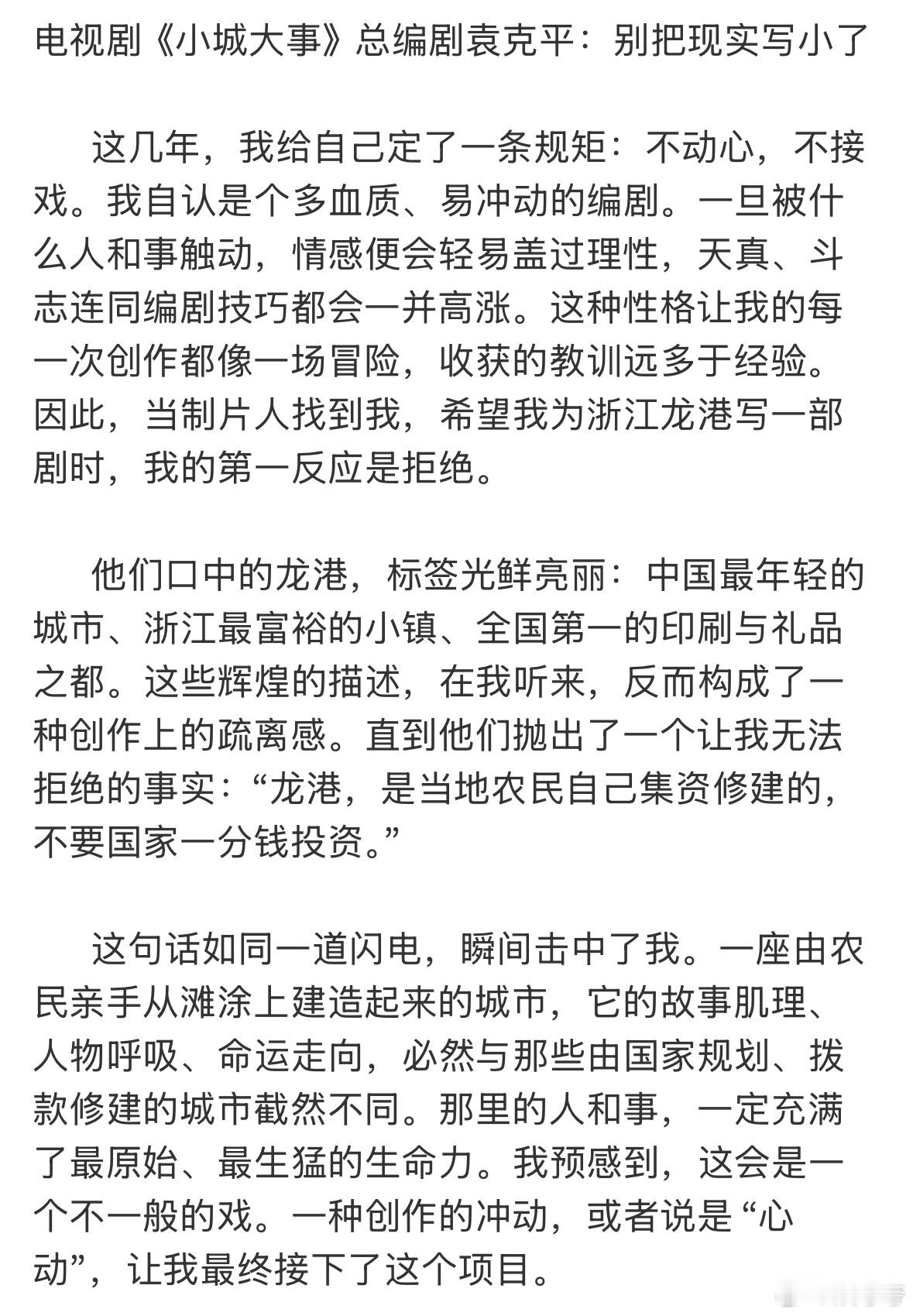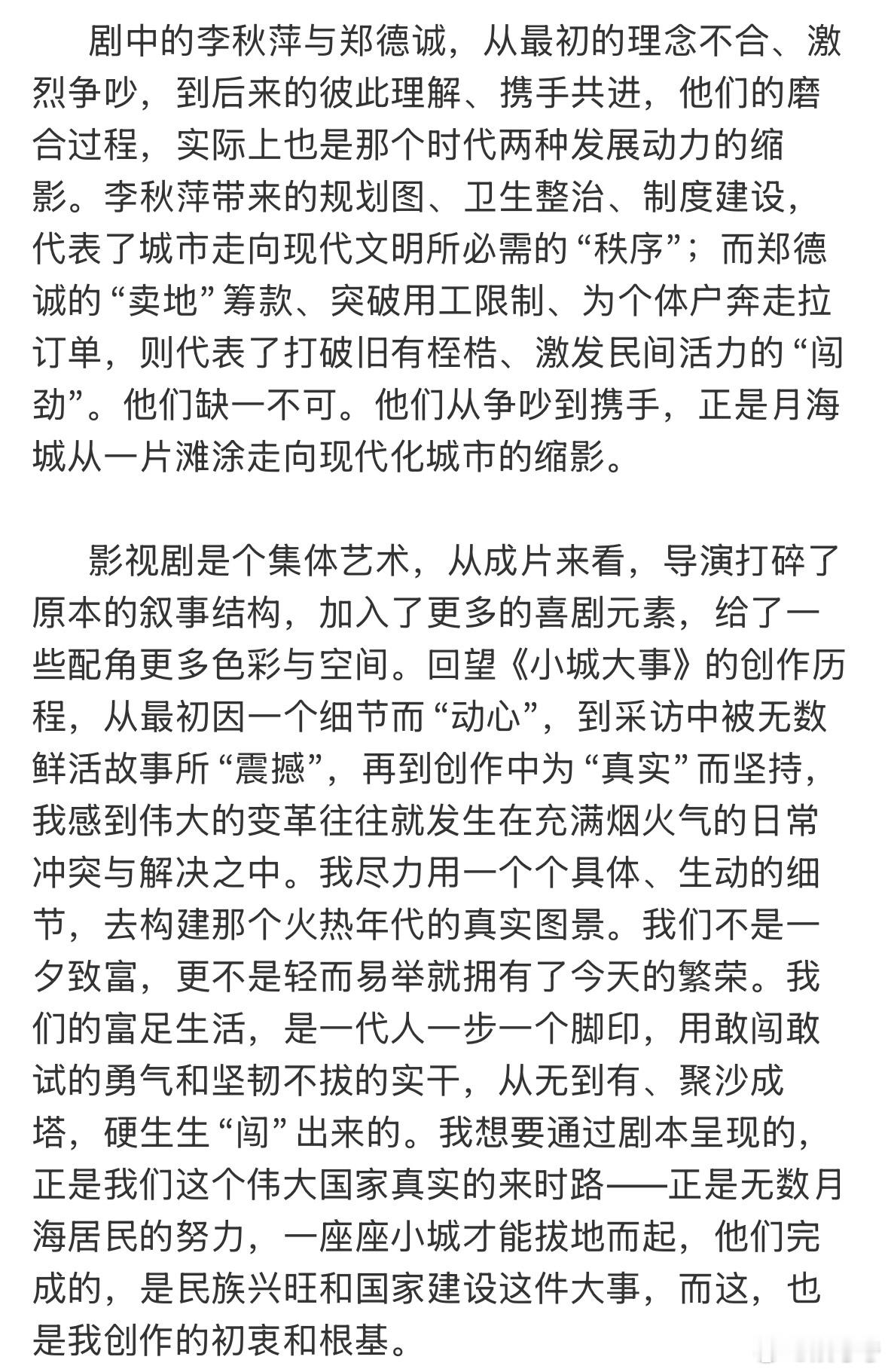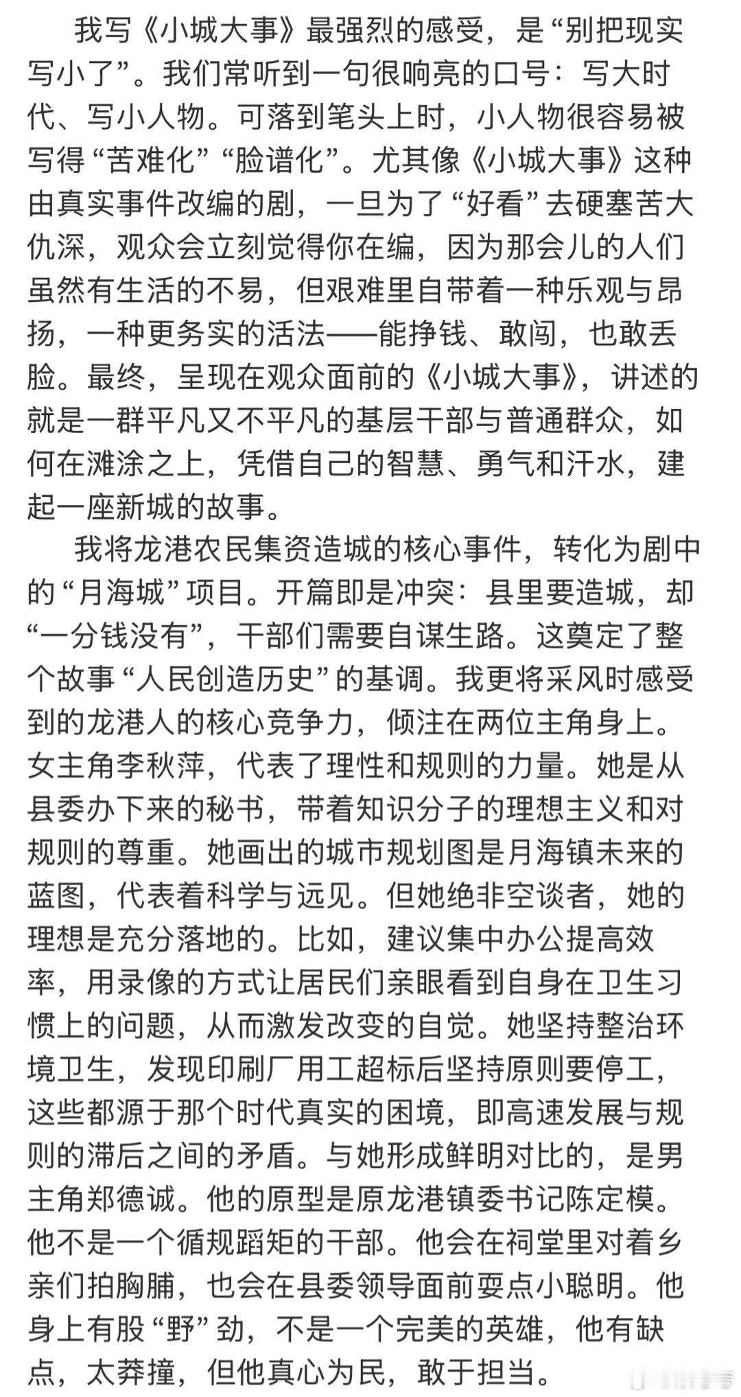 小城大事26集好燃 看了广电发的小城大事 这篇文章就懂了为什么月海的建城故事会这么精彩,编剧说他想通过剧本呈现的,正是我们这个伟大国家真实的来时路——正是无数月海居民的努力,一座座小城才能拔地而起,他们完成的,是民族兴旺和国家建设这件大事,这也是他的创作初衷和根基。我们小城大事真的立意高
