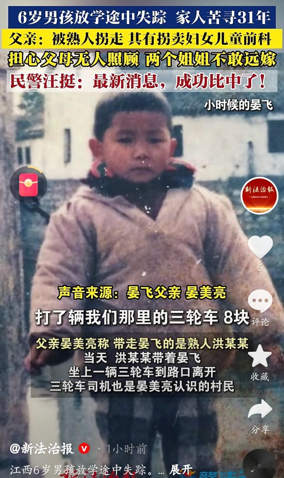 31年的等待,终于等到团圆的曙光! 1995年的那个下午,江西南昌6岁的晏飞在离家仅150米的幼儿园放学路上失踪。父亲晏美亮后来得知,带走孩子的是有拐卖前科的熟人洪某某。 此后31年里,晏家从未放弃寻找。两个姐姐为了照顾父母,不敢远嫁。父亲晏美亮走遍各地,甚至远赴福建石狮,却始终没有孩子的消息。 就在近日,传来了令人振奋的消息:民警汪挺宣布DNA成功比对中了!这意味着一家人跨越31年的漫长等待,终于要迎来团圆的时刻。 这不仅是一个家庭的希望,也让我们看到了坚持的力量。愿晏飞早日回到父母和姐姐身边,弥补这31年的思念与遗憾。