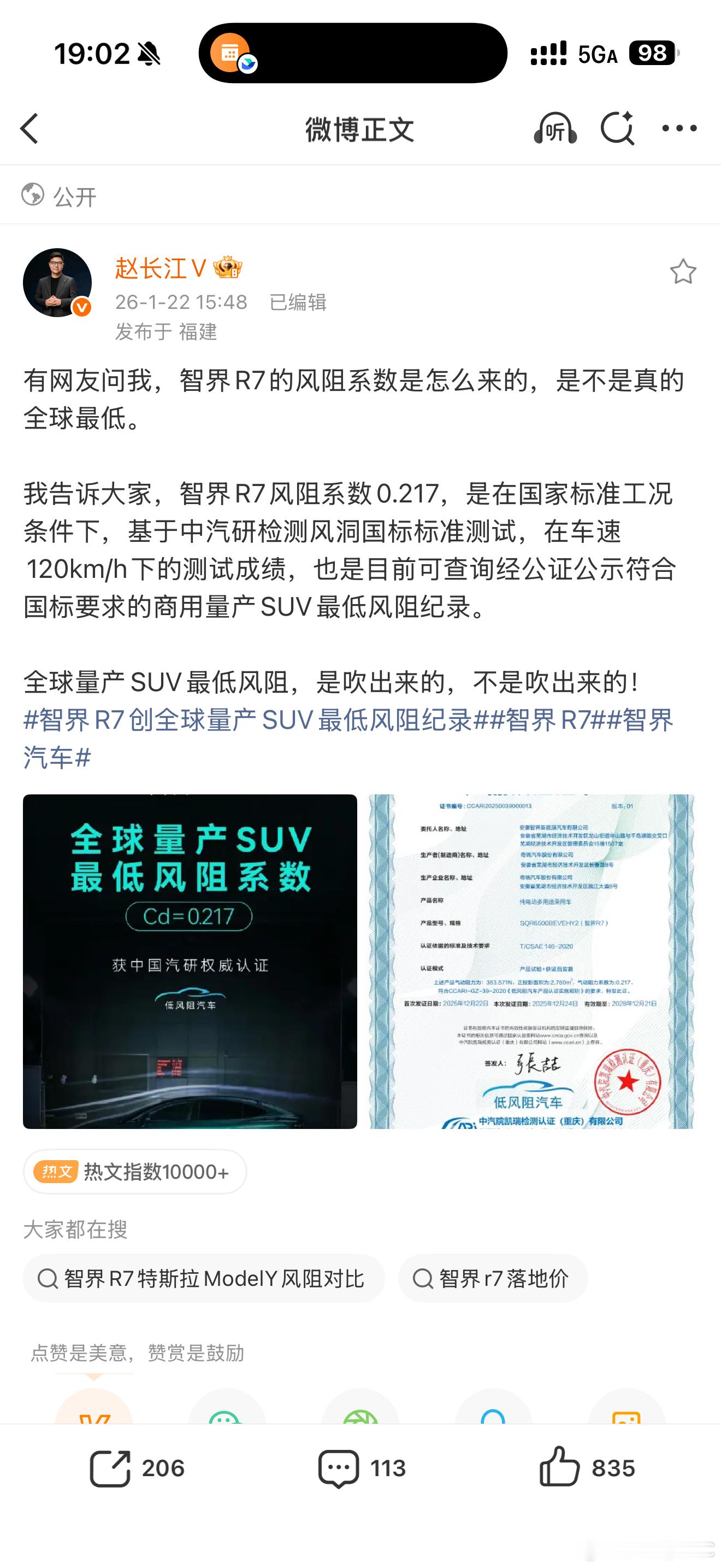必须给赵总和智界点个赞。1. 智界R7 风阻系数 0.217 是国家标准工况,而且说清楚是 120km/h 测出的数据;2.风阻系数写法完全正确,没有写成 0.217Cd,也没有写成 Cd 0.217,Cd 是一个系数不是单位。