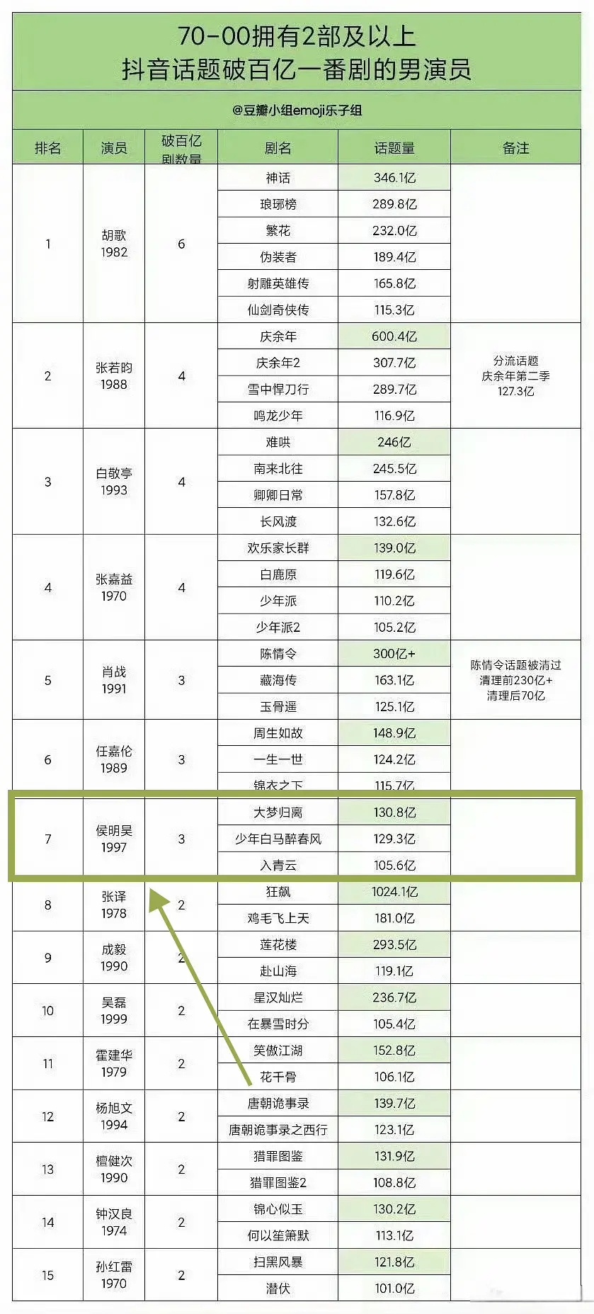 侯明昊播剧没有声量?那看看真实数据1️⃣三部一番剧在抖破百亿2️⃣个人角色抖音
