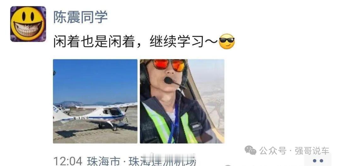 之前因税务问题被罚款247万的车评人陈震,人家跑去珠海学开飞机了。上周我还跟他乘坐同一航班从珠海回北京,这次他朋友圈里发了张照片,坐在驾驶舱,戴着耳机,一脸认真。定位是珠海莲洲机场。下面一行字:“闲着也是闲着,继续学习~” 这说明啥?果然陈震的应对危机的能力确实厉害,不在家闲着,勤于学习,换了赛道,评车是过去时了,以后说不定要评飞机了! 北京·首都机场T3航站楼