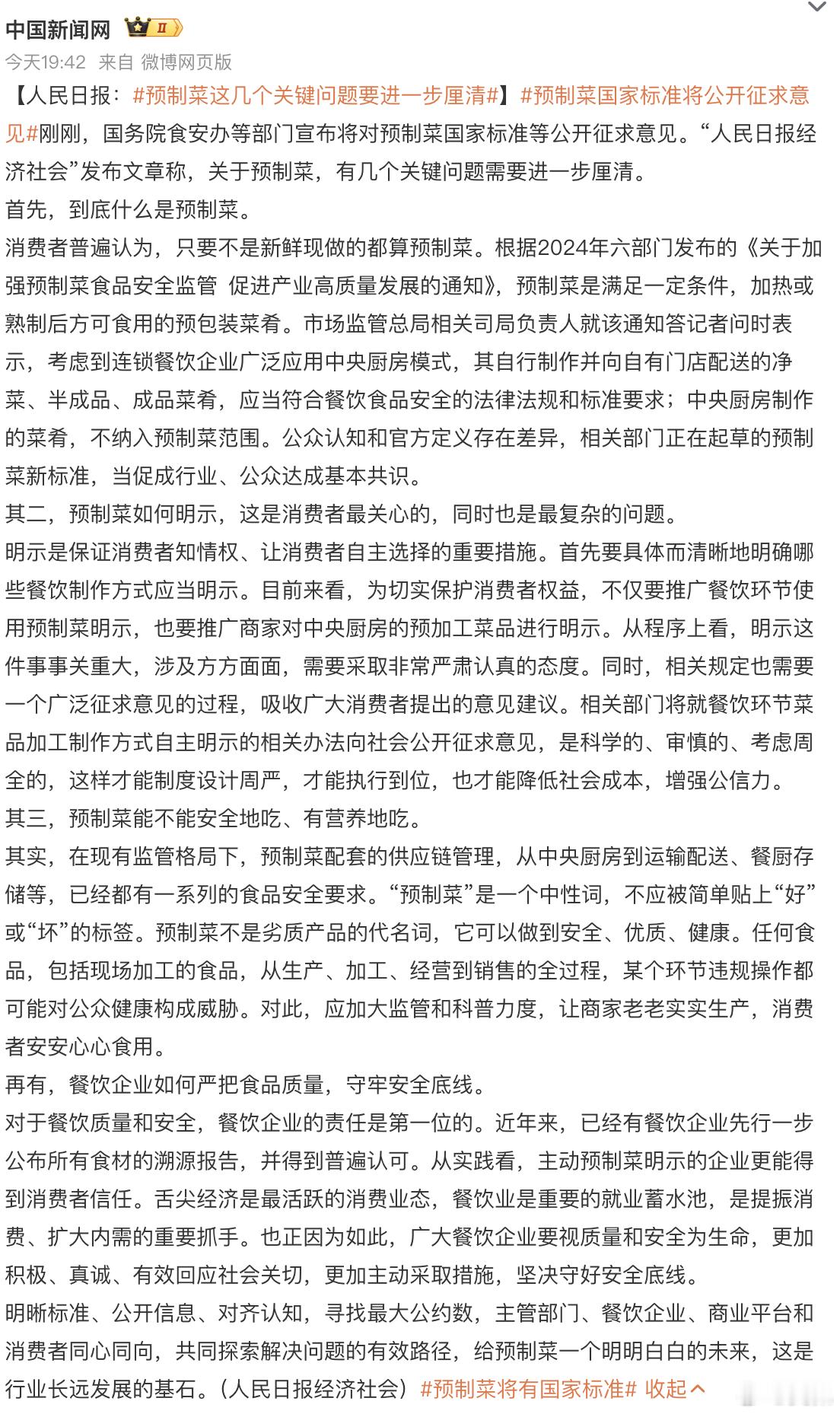 公众认知和官方定义存在差异,相关部门正在起草的预制菜新标准。“中央厨房制作的菜肴,不纳入预制菜范围”这条就值得商榷,能不能改改?预制菜将有国家标准对预制菜国家标准等公开征求意见预制菜这几个关键问题要进一步厘清