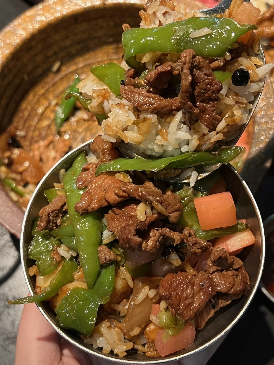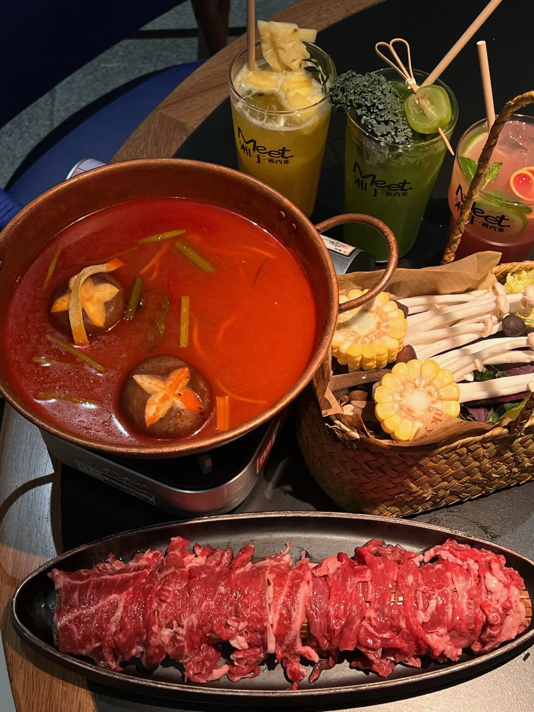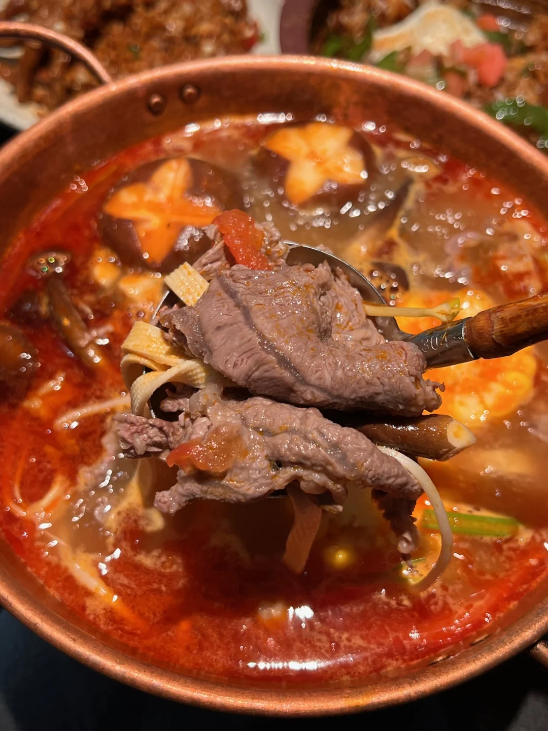 酸汤鲜爽开胃,煮开后木姜子香直钻鼻腔,现涮的牛肉裹满汤汁,嫩到滑喉,连喝两碗汤都不够过瘾