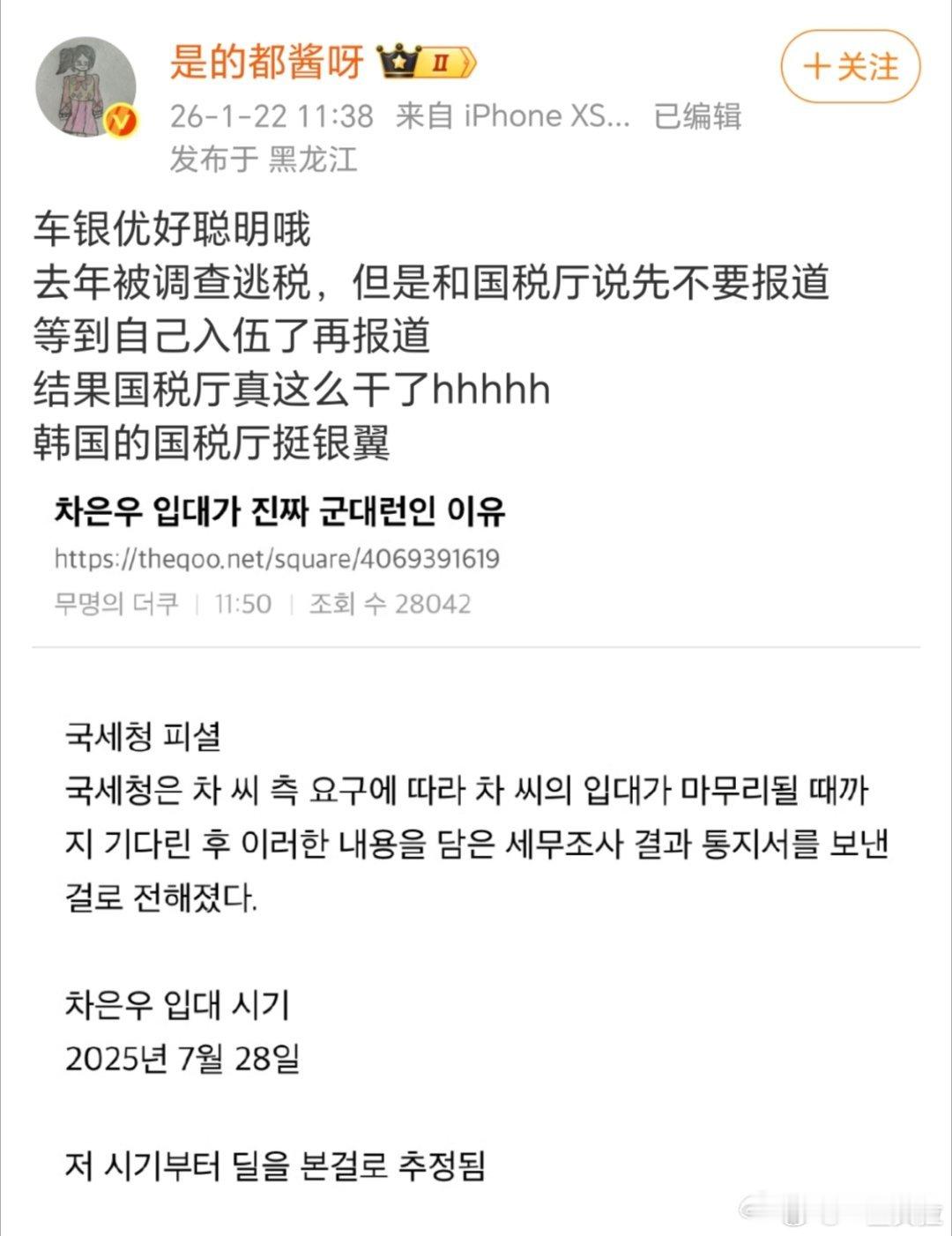 你就说这男的鸡贼不鸡贼吧用来逃税的公司是母亲为了保护儿子才设立的新闻要求国税厅入伍之后再报道车银优被韩网友喊话退圈