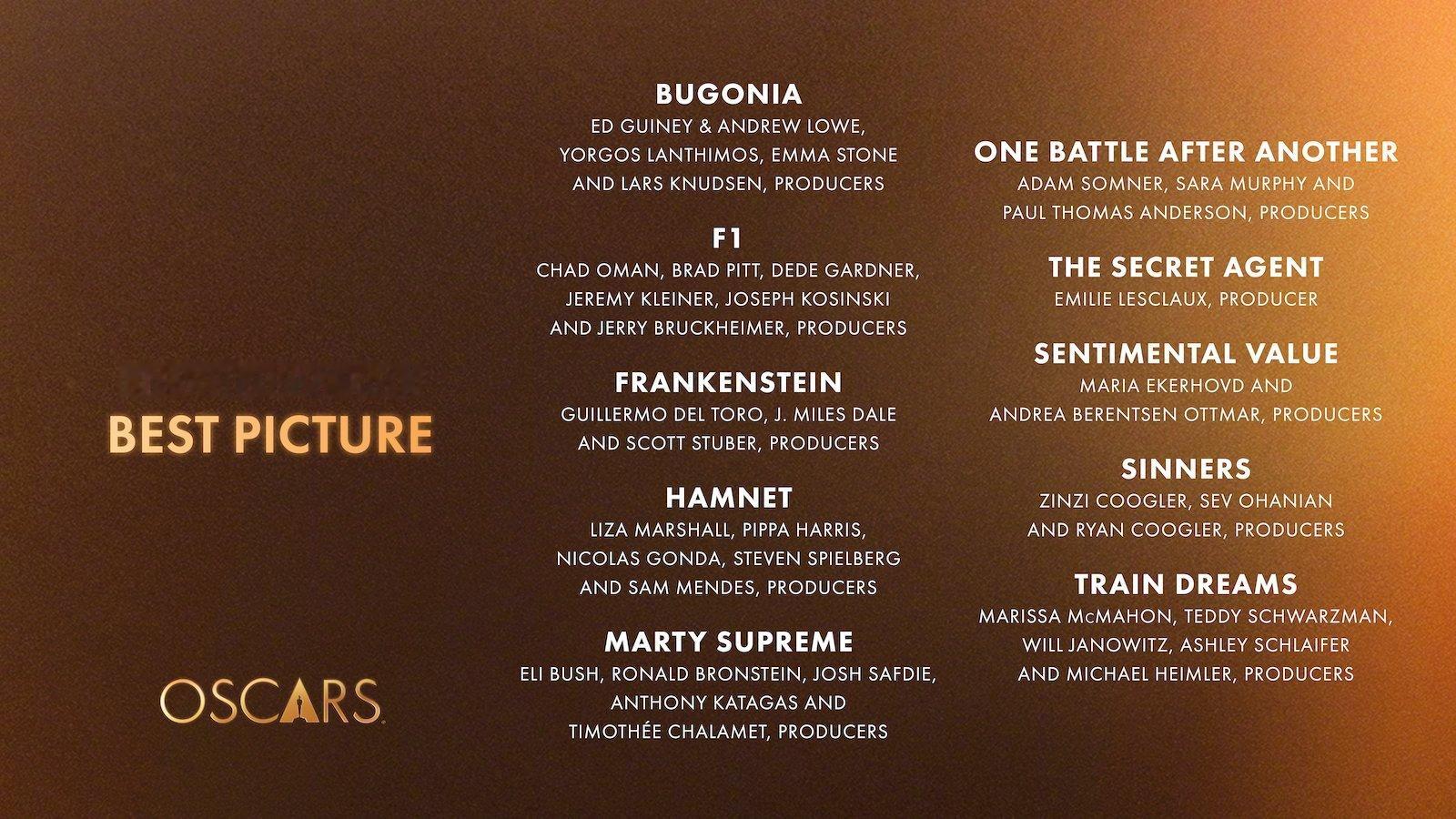 奥斯卡最佳影片提名出炉,最终谁能笑到最后?《拯救地球》《F1:狂飙飞车》《弗兰肯斯坦》《哈姆奈特》《至尊马蒂》《一战再战》《秘探》《情感价值》《罪人》《火车梦》