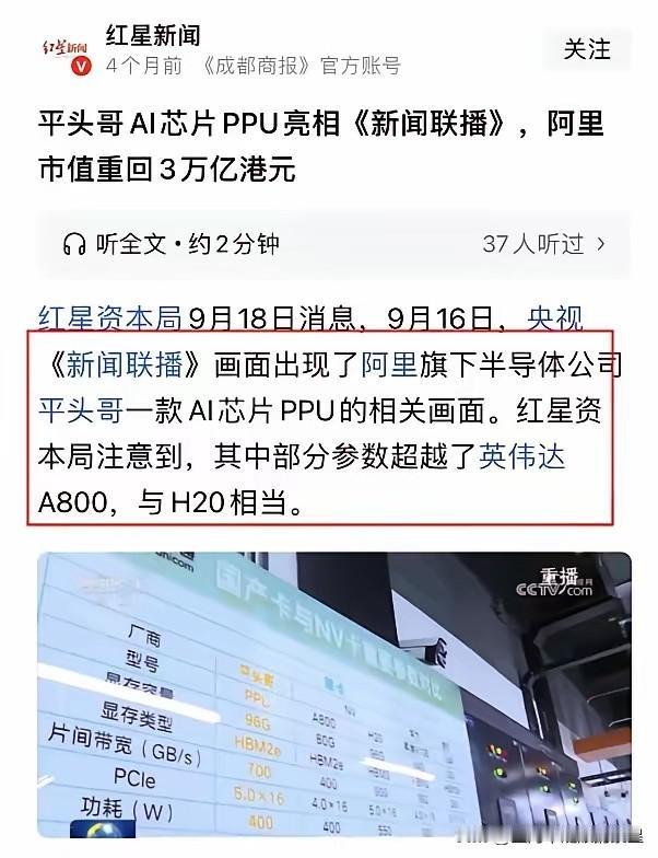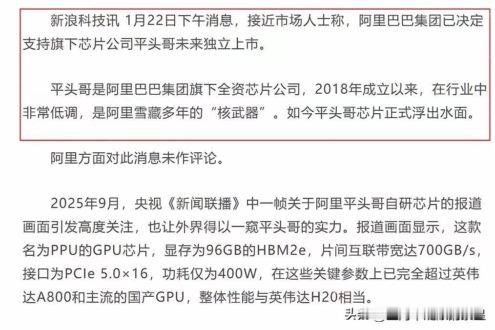 时隔四个月,新闻联播中被网友热议的一幕,揭晓了答案! 2025年9月,央视《新闻联播》中报道国产芯片时,有一帧将镜头放到了一个名为平头哥的芯片厂商身上。 当时那几秒镜头,很多人没看明白。画面里一张表格,平头哥的芯片参数和英伟达的明星产品放在一块比。不是简单露脸,是实打实地对标。数据就摆在那儿,平头哥的部分指标甚至更抢眼。最厉害的是,这芯片不是图纸货,已经装在青海的智算中心里跑起来了,上万张卡真刀真枪在干活。 现在全懂了。四个月后消息出来,阿里巴巴打算支持平头哥未来自己上市。从新闻联播的惊鸿一瞥,到真金白银的上市计划,这条路画得明明白白。那晚的镜头根本就是预告片,正片现在才开场。平头哥早不是阿里内部的一个部门,它要自己到大海里游泳去了。 它敢这么闯,手里确实有货。不光有和英伟达较劲的AI芯片,还有做服务器的CPU,做图像识别的专用芯片,甚至连你家智能音箱里可能都有它的小芯片。从云到端,它都能做。这种全家桶式的玩法,别家很难学。背靠阿里云这棵大树,它的芯片出生就有地方用,边用边改,这和那些先造芯片再找客户的公司完全不一样。 看看股市就懂了。最近一阵子,几家做国产GPU的公司接连上市,市值冲得很高。大家愿意为自主可控的故事买单。平头哥手里的牌更全,故事也更实在,它要是上市,动静估计小不了。这不止是一家公司的事,可能整个国产芯片的估值逻辑都会被它搅动。 回过头琢磨新闻联播那个镜头,味道全对了。那是在说两件事:咱们在高性能芯片这块,有能上牌桌的选手了;而且咱们玩的是从芯片到软件到应用的整体生态,不是单点突破。平头哥站到前排,意味着阿里在AI时代最硬的那块骨头,自己啃下来了。 搞芯片这事,急不得也等不得。换个技术路线就像给高速飞行的飞机换引擎,难,但必须做。平头哥往前冲,就是在这条难走的路上又踩实一步。上市不是终点,是更激烈比赛的发令枪。 各位读者你们怎么看?欢迎在评论区讨论。