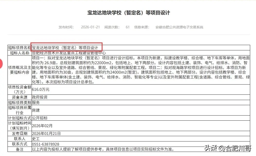 现拟对宝龙达地块学校(暂定名)项目进行设计招标。本项目为新建,拟建设教学楼、综合楼、地下车库等单体,用地面积约为 26.9亩,总规划建筑面积约为22000m2,包括地上、地下两部分。设计内容包括土建、装饰、电气、给排水、消防、智能化等专业以及室外道路、综合管线、景观、绿化等附属配套工程。