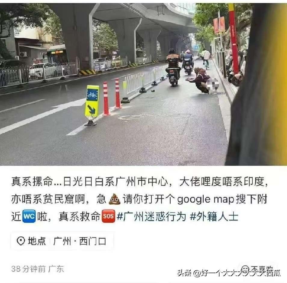 有网友发了张照片到网上一下子爆了, 因为照片描述的是大白天的在广州街头有一个疑似印度人的老外当街大便, 网友们纷纷表示为什么要放这样的人进来。 实话说大多数印度人对于卫生的重视程度非常不够, 而且他们自己是没有任何感觉的, 到什么国家都像是还在印度国内, 想怎么弄就怎么弄, 这样的人建议有一个法律来管一管, 能不能学学新加坡打打鞭刑什么的。
