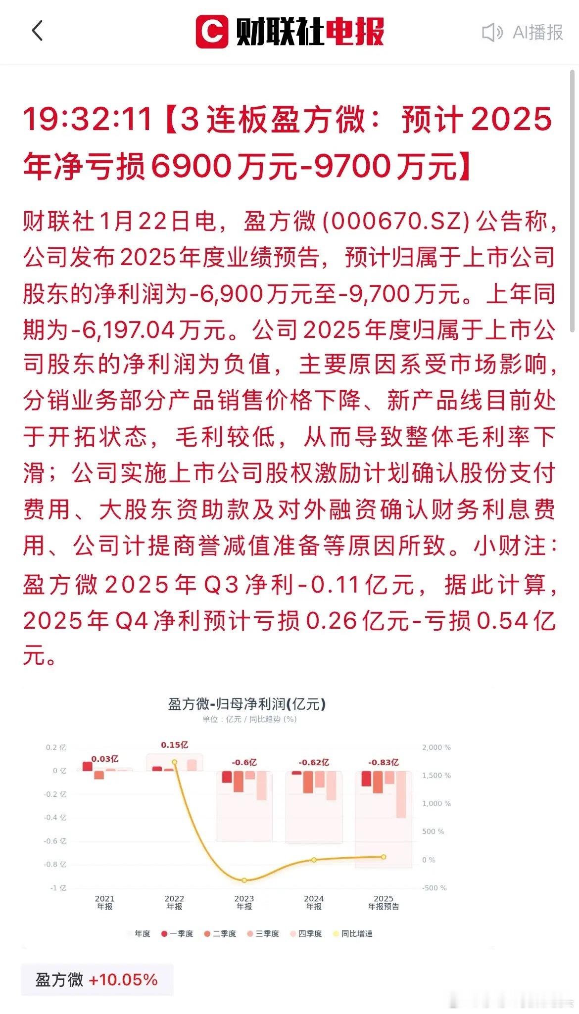 3连板芯片牛股突曝雷!盈方微预告全年最高亏近亿,是要“埋人”了吗?三连板的“盈方微”刚刚发布业绩“雷”!公司最新公告显示,预计2025年度净利润将亏损6900~9700万元,亏损额较上年进一步扩大。这意味着,仅第四季度就亏掉了约2600~5400万,亏损速度明显加快。对于亏损原因,公司解释为产品降价导致毛利率下滑、股权激励费用、利息支出以及计提商誉减值等。其中,“商誉减值”一项尤为刺眼,往往暗示着此前收购的资产并未达到预期效益。值得注意的是,这份成绩单发布前,公司股价已凭借芯片等题材的热度,收出强势三连板,成交量急剧放大,吸引大量跟风资金入场。如今业绩预告与火爆走势形成鲜明对比,被市场戏称为“基本面撑不住涨停板”。业内分析指出,在题材炒作高位遭遇实质性利空,通常意味着行情可能随时“熄火”。警钟已敲响,切勿成为击鼓传花中最后一棒!