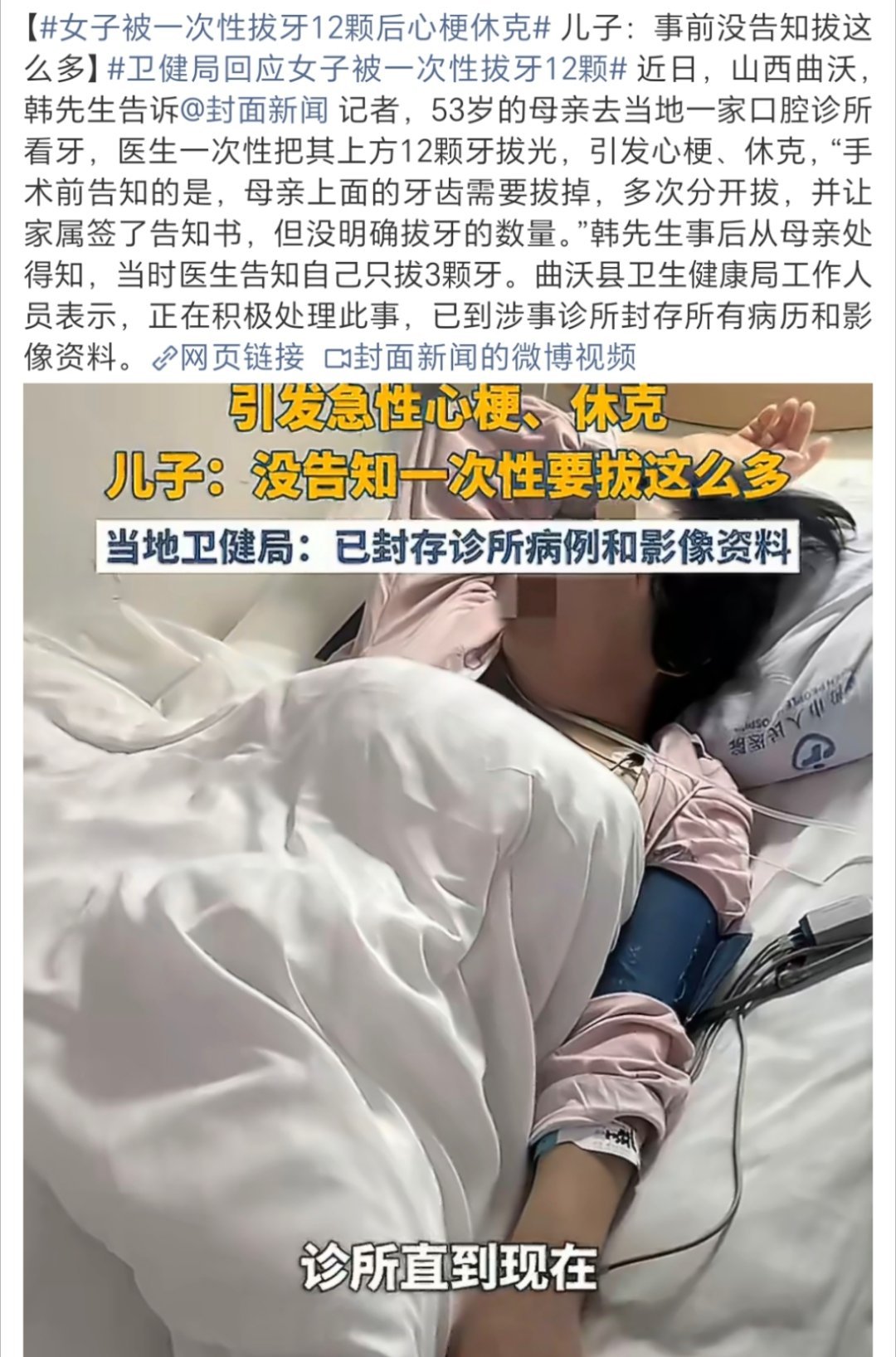 女子被一次性拔牙12颗后心梗休克就好奇怪 这两年的牙医们都怎么回事不是拔错牙 就是东西留在牙龈里 就是一次不知道拔多少颗上网课没有教这些 所以都不会 就随意发挥?