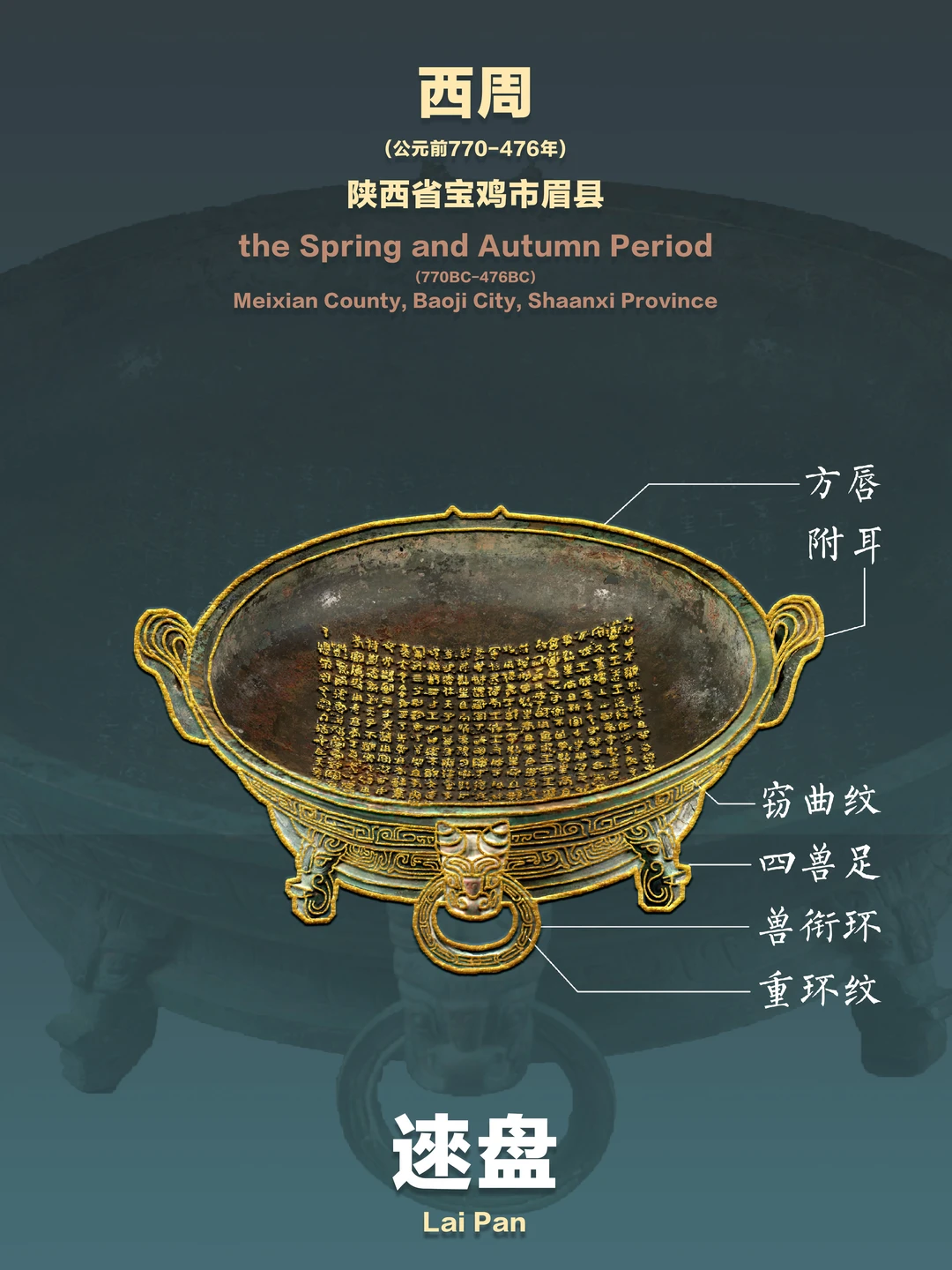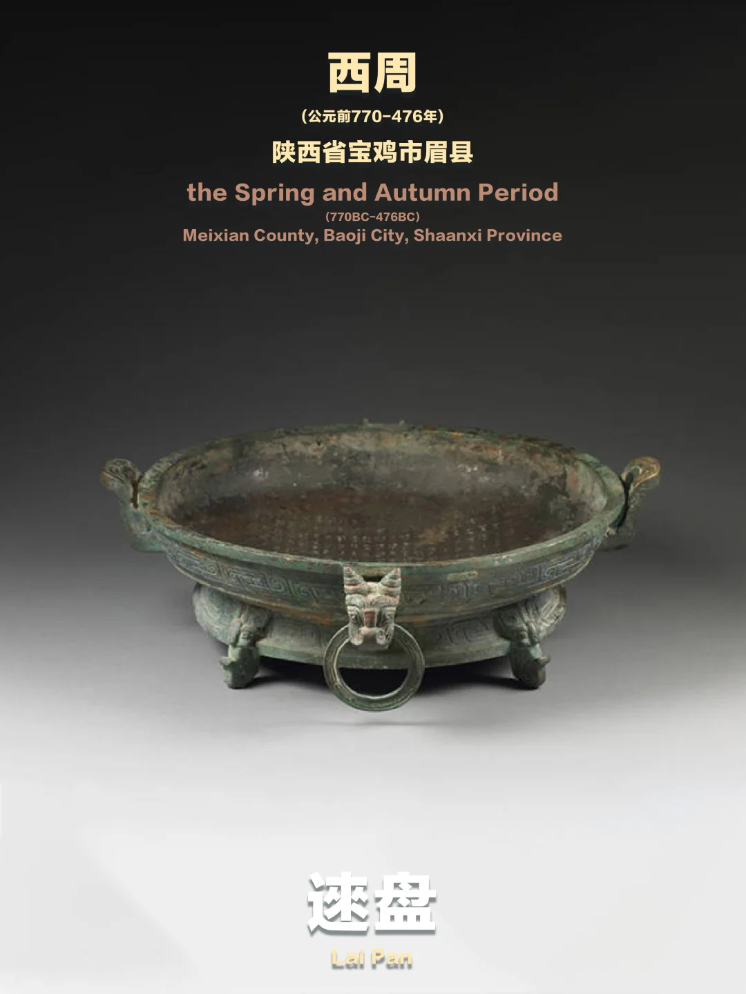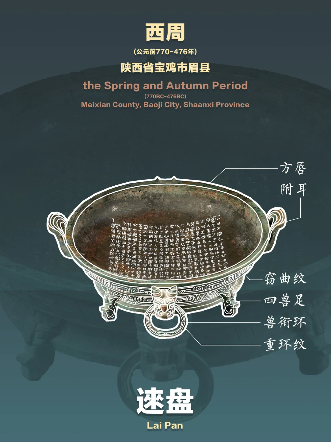 📍逨盘高20.4厘米,口径53.6厘米,腹及圈足装饰窃曲纹,兽首衔环威严肃穆,四足撑起千年厚重。作为西周贵族“沃盥之礼”的盛水器,它与匜配合使用,见证了礼仪文明的细节。