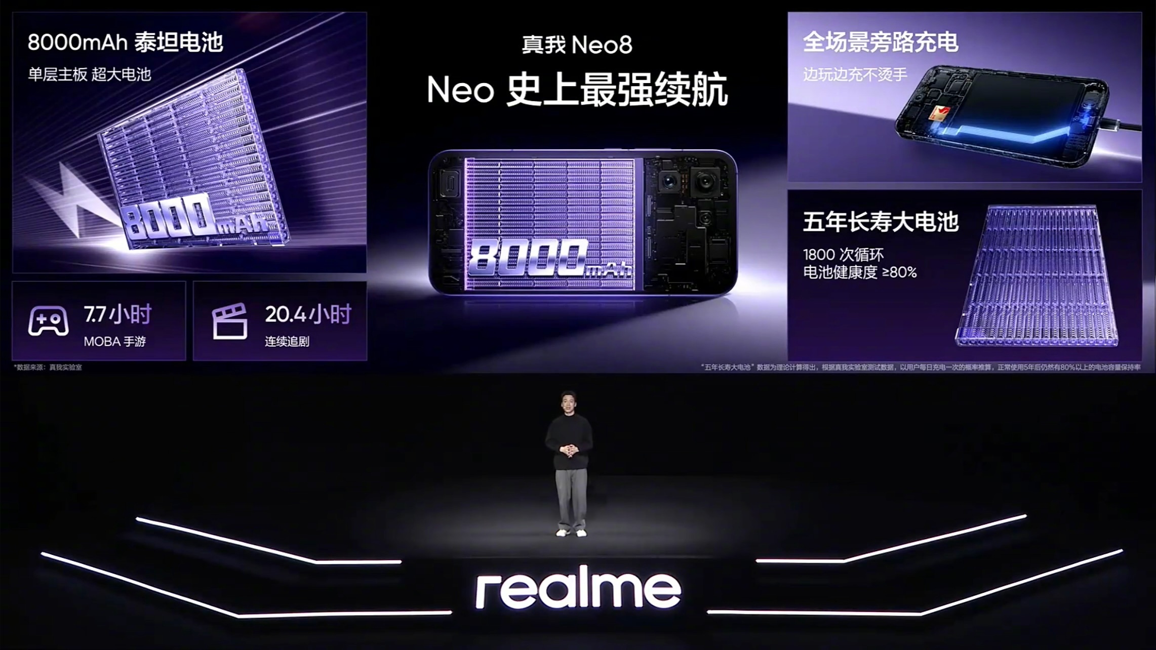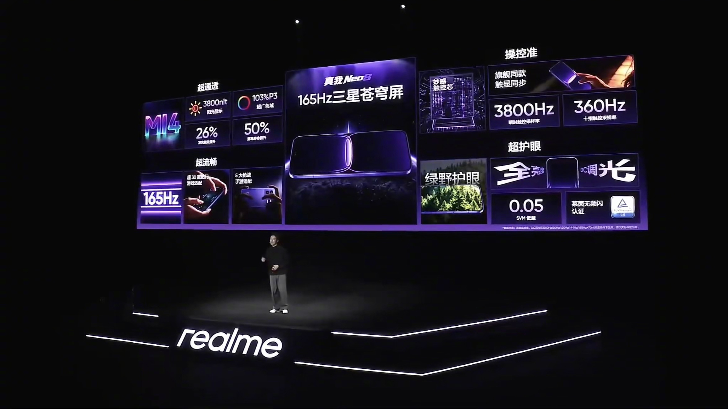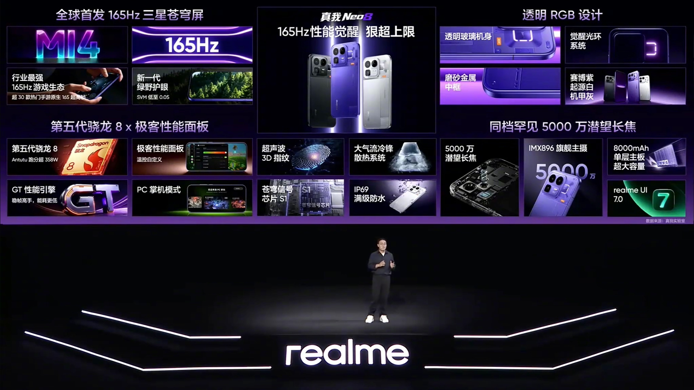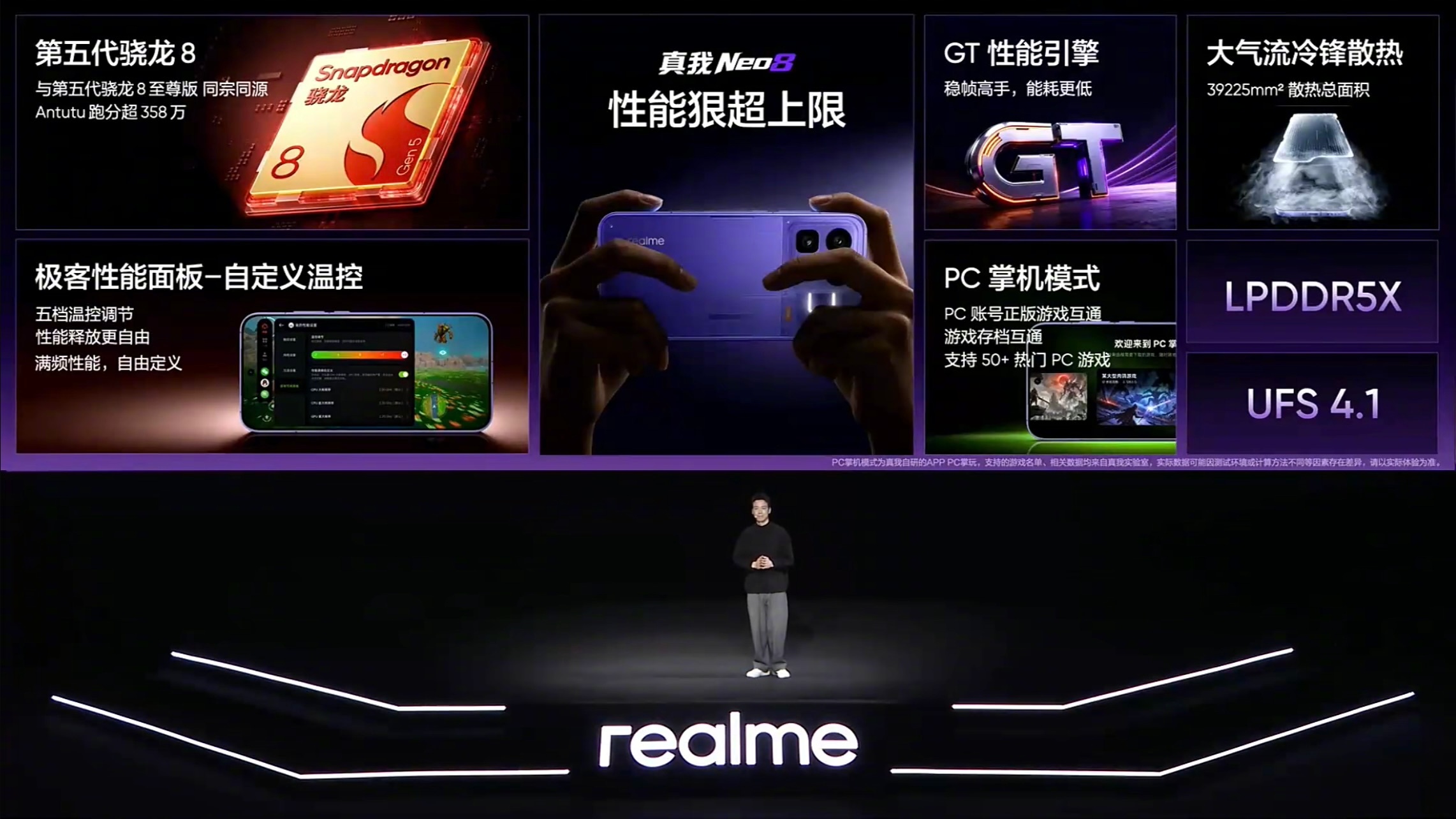 今晚,真我正式带来全新一代性能旗舰真我 Neo8。这场发布会的信号非常清晰:Neo8 并不是在参数表里“刚好够用”,而是直接把目标对准高帧游戏、长时间稳定输出,以及年轻用户真正会用到的体验,试图在同档位里把“性能感知”这件事一次性做透。屏幕是真我 Neo8 最先拉开差距的地方。它全球首发 165Hz 三星苍穹屏,并采用三星 M14 旗舰发光材料。高刷新率只是基础,更关键的是在通透度、亮度和护眼之间做到了同步在线:高亮场景下画面不泛白,暗光环境中依然保持低频闪表现。配合旗舰同款的游戏触显同步技术,以及最高 3800Hz 瞬时触控采样率,在 FPS、MOBA 等竞技类游戏中,画面与操作之间的反馈非常直接,延迟感被进一步压缩。性能层面,真我 Neo8 搭载 第五代骁龙 8 旗舰芯片,但它并没有把“性能释放”完全交给系统自动判断,而是选择把一部分控制权交还给用户。行业唯一的极客性能面板,支持 CPU、GPU 频率与五档温控自由调节,高负载时可以选择满血输出,长时间游玩也能通过调节换取更稳定的手感。发布会同时公布,Neo8 已覆盖 19 款原生 165 帧游戏生态,并首发 PC 掌机模式,把 Steam 游戏带入手机形态,使用边界进一步打开。为了支撑持续高帧运行,真我 Neo8 在散热和续航上同样没有保守。大气流冷锋散热系统 配合 39225mm² 总散热面积 与单层主板方案,让热量分布更均匀;8000mAh 泰坦电池 在厚度可控的前提下,显著缓解高刷高性能下的续航焦虑。再加上 80W 闪充 与 全协议旁路供电,长时间边玩边充也能有效控制发热与降频。设计层面,透明 RGB 背板与觉醒光环系统依然是真我 Neo系列最具辨识度的元素,灯效与游戏、音乐、通知深度联动,既保留电竞氛围,也强化了整机个性表达。影像方面,同档唯一的 50MP 潜望长焦,为日常拍摄提供更自由的构图与变焦空间,实用性明显提升。整体来看,真我 Neo8 并不是走“全面但平淡”的路线,而是把 屏幕、高帧游戏、性能自由度与潮玩设计 集中打磨。如果你在意的是游戏体验是否够稳、够爽,同时又希望手机本身有鲜明性格,真我 Neo8 的完成度已经明显越级。最后还同步带来新款真我Buds Air8耳机。真我Neo8首销优惠价格如下:12GB + 256GB 2399元12GB + 512GB 2899 元16GB + 256GB 2699元16GB + 512GB 3199 元16GB + 1TB 3699元真我Buds Air8首销价格269元,搭配真我Neo8购买价格239元