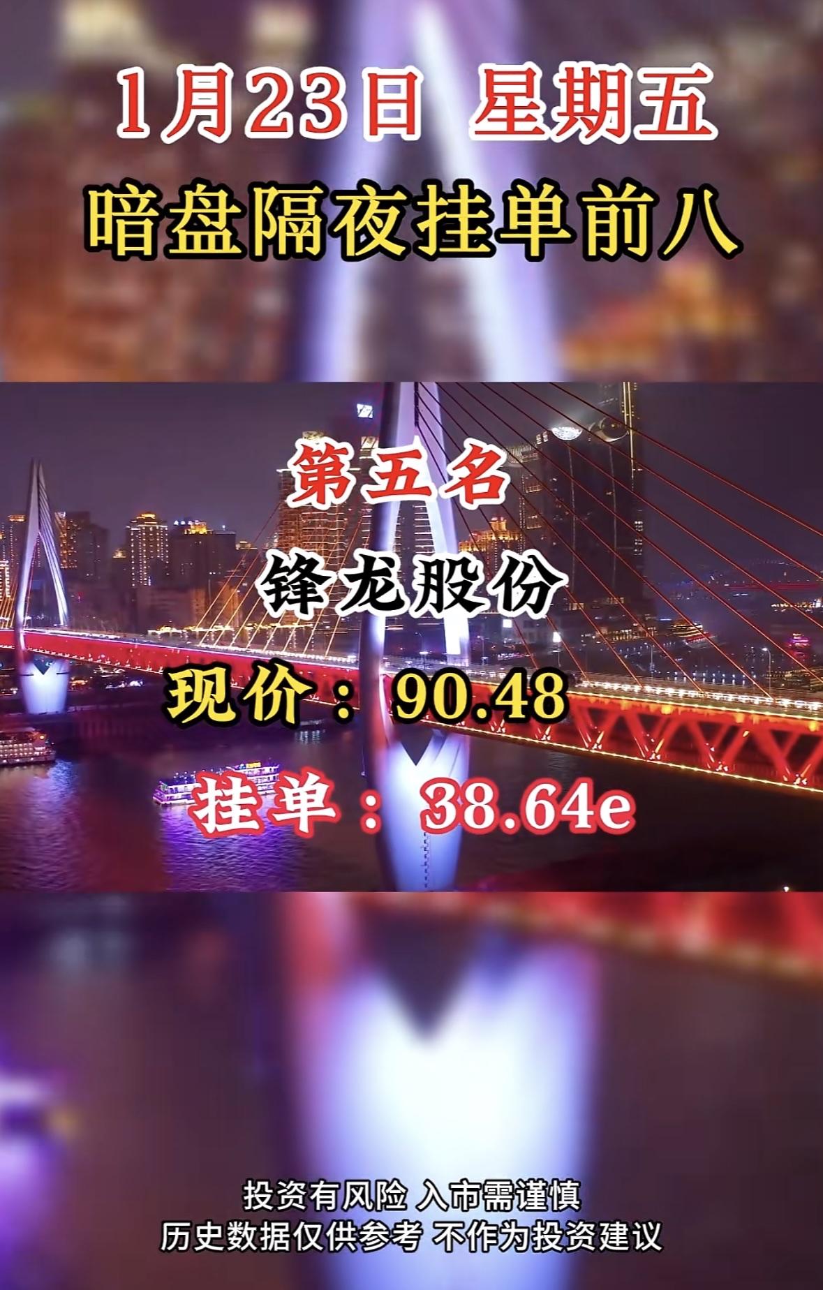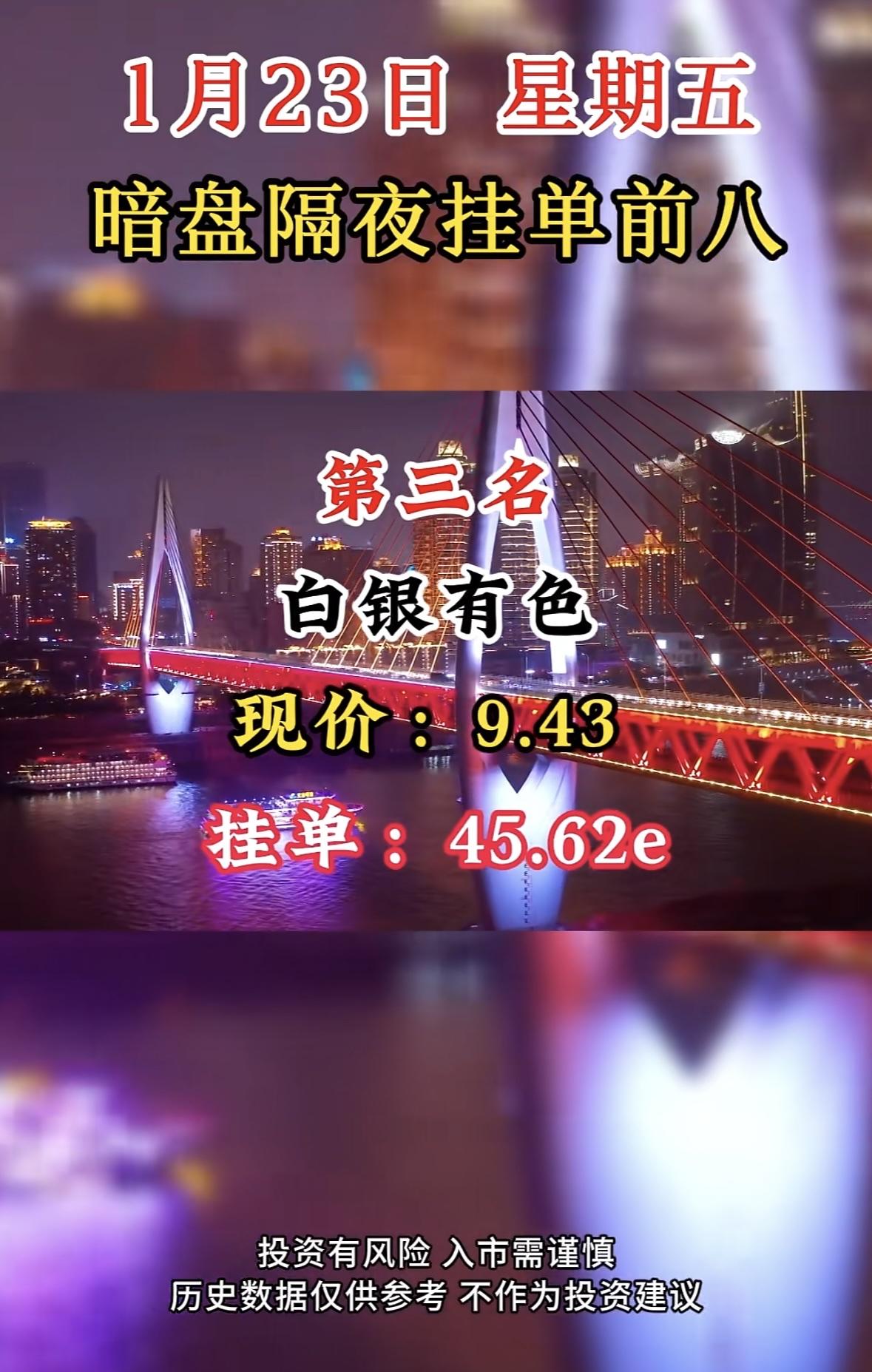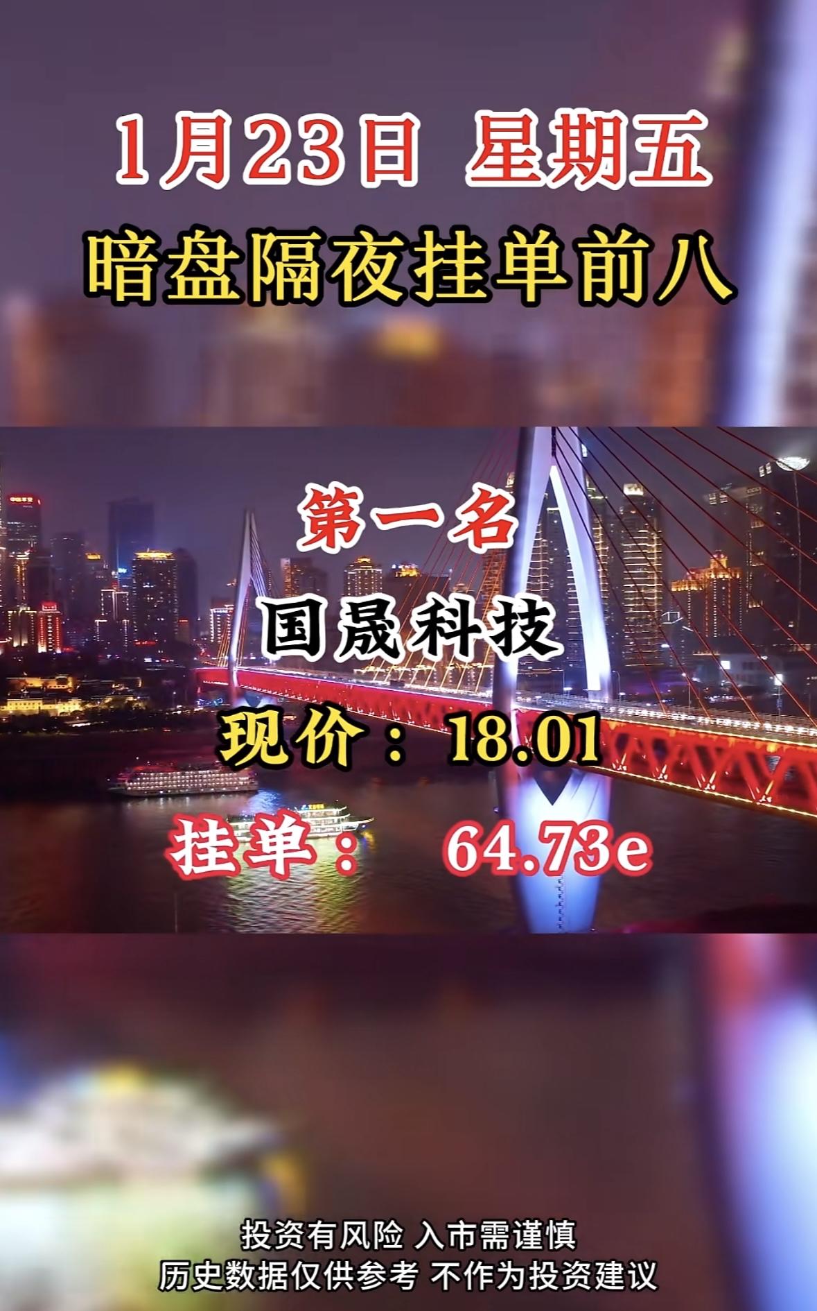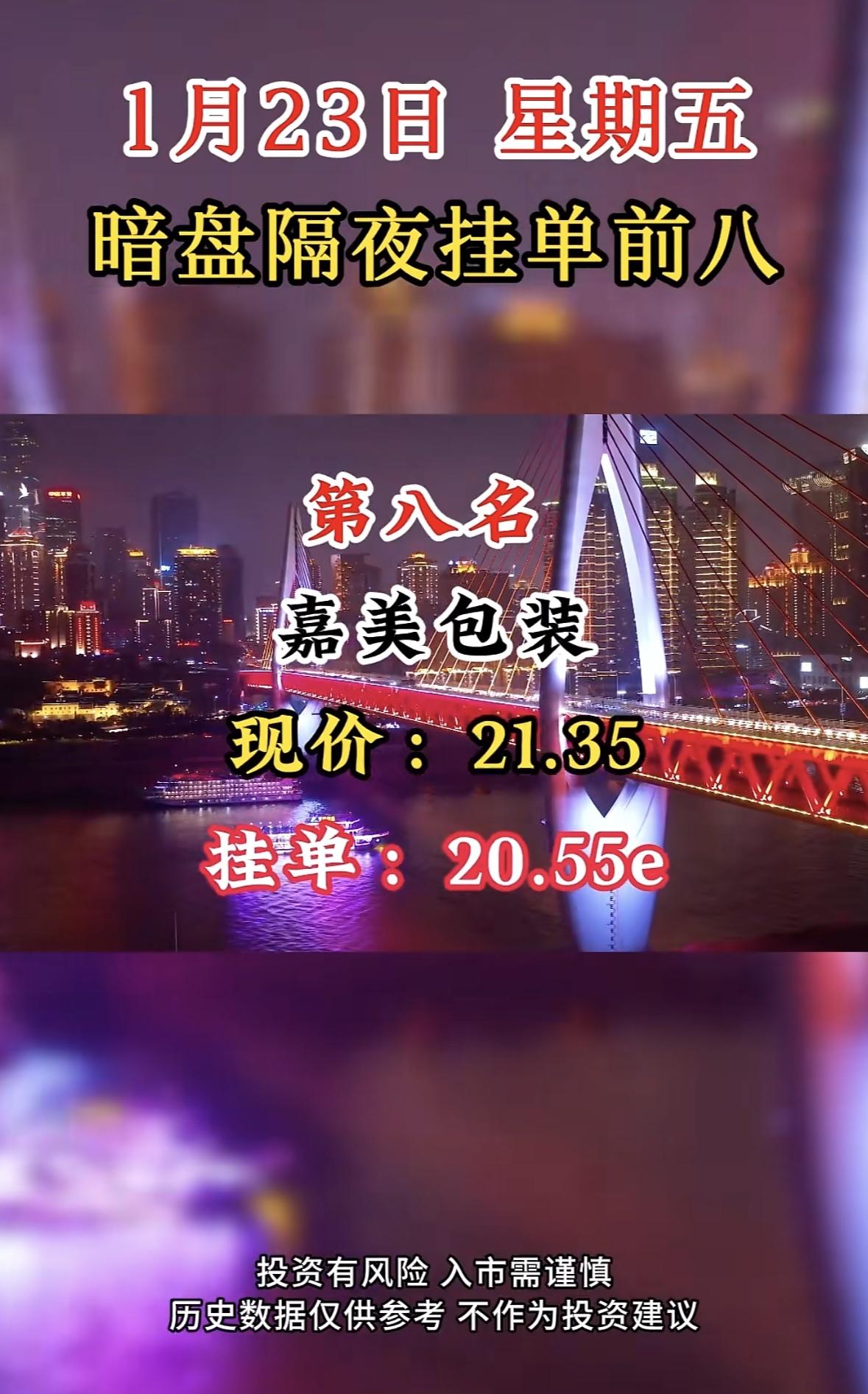 1月23日暗盘隔夜挂单前八:嘉美包装,现价21.35,挂单20.55e 国晟科技暗盘挂单居首,市场热度高。投资需谨慎,过往表现不预示未来收益。理性决策,防范风险。
