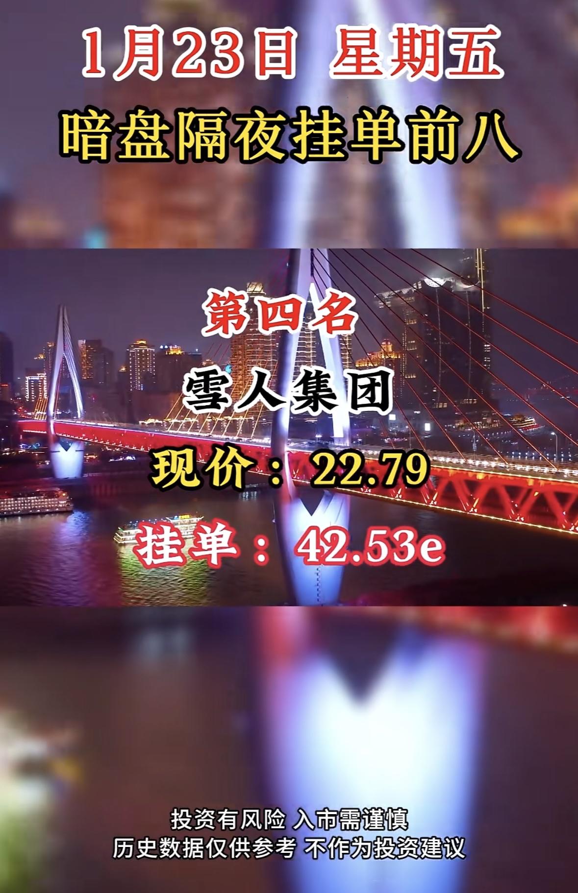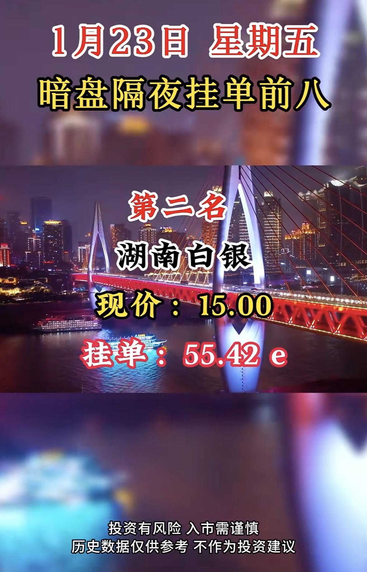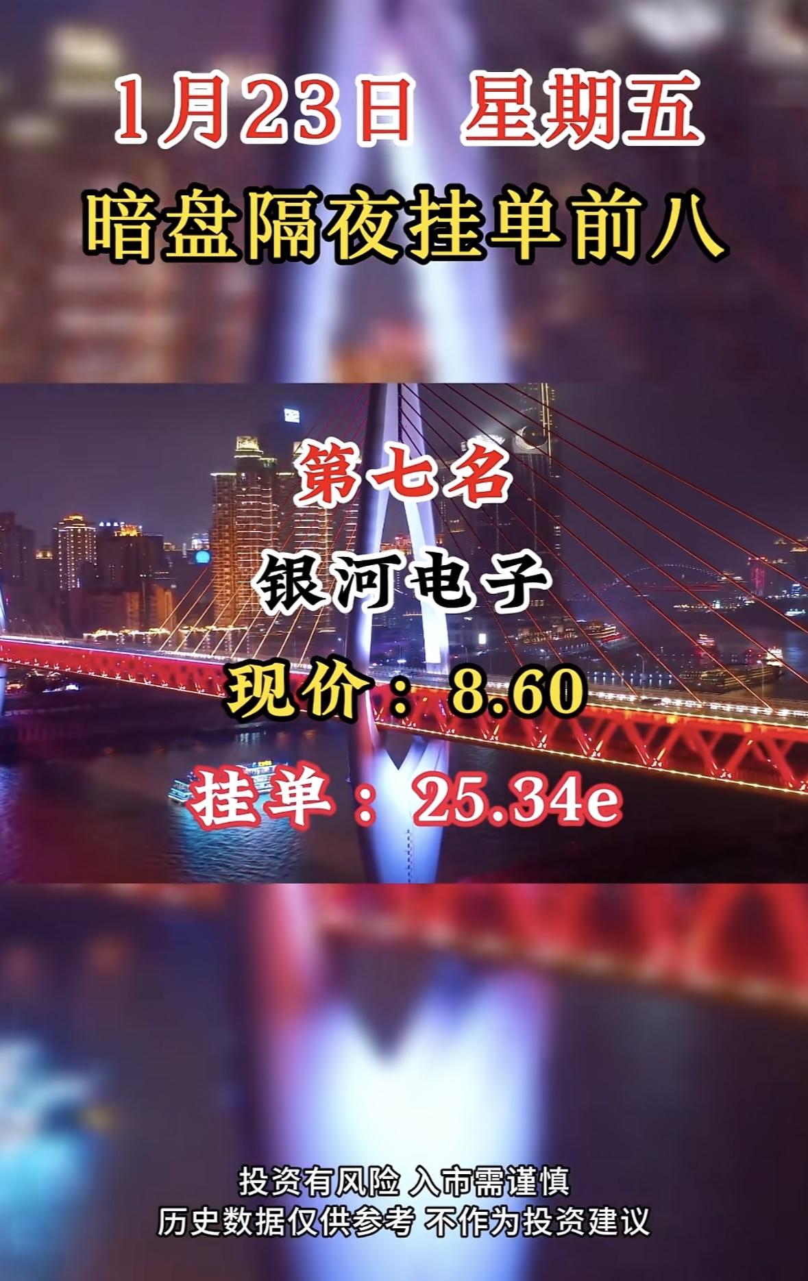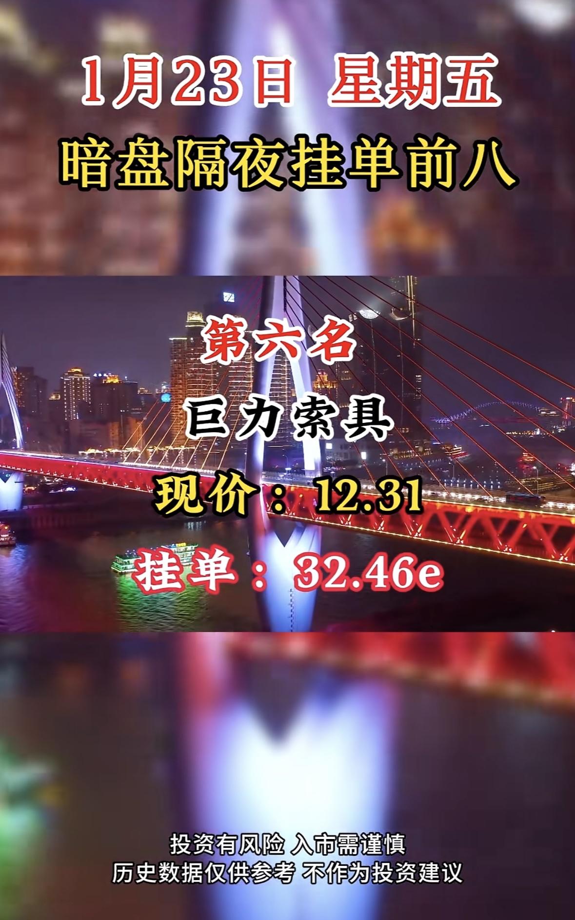 1月23日暗盘隔夜挂单前八:嘉美包装,现价21.35,挂单20.55e 国晟科技暗盘挂单居首,市场热度高。投资需谨慎,过往表现不预示未来收益。理性决策,防范风险。