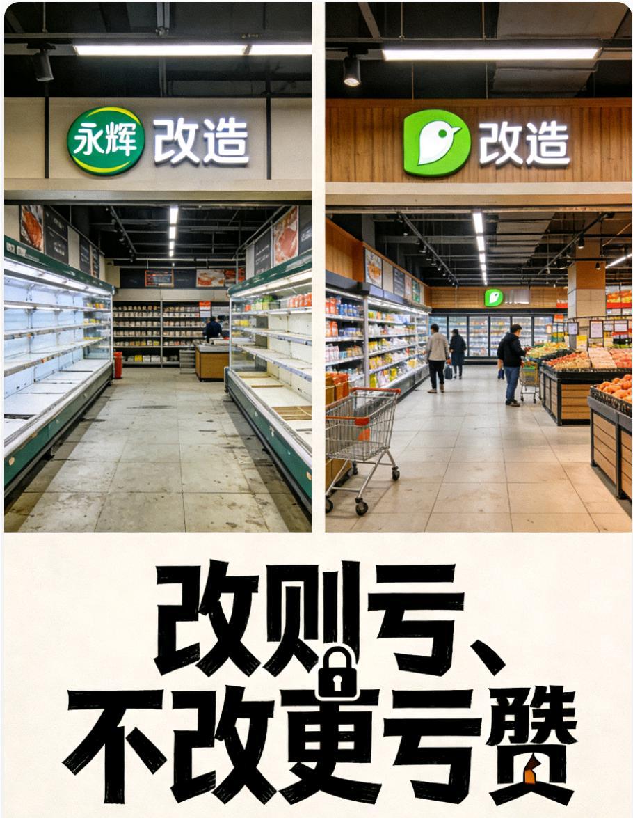 永辉胖改20个月,叫好却难抵整体亏损😮💨 永辉效仿胖东来改革已满20个月✅,调改门店战绩亮眼,客流暴涨80%、销售额翻倍,部分门店盈利超五年峰值,服务和品控获好评满满👍! 但亮眼单店成绩难挽整体颓势,2025年预亏超20亿,已是连续五年亏损😰!核心问题是调改门店占比低,且单店改造成本高,关店+装修+人员优化砸下巨额成本,前期投入远没回本💰。 叠加行业寒冬,线上电商、社区团购分流客源,未调改门店持续拖后腿,再加上供应链改革阵痛,永辉转型陷入“改则亏、不改更亏”的两难🔒。 如今永辉靠定增募资续命,计划3-5年完成全面转型,这场胖改翻身仗,能不能打赢还得看后续落地📌 胖改物美超市 胖永辉万达